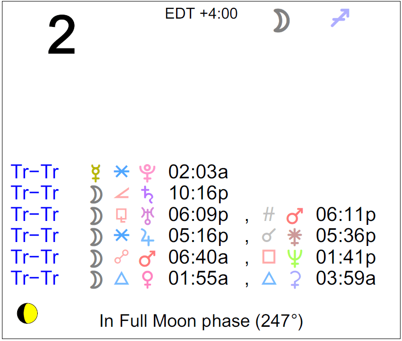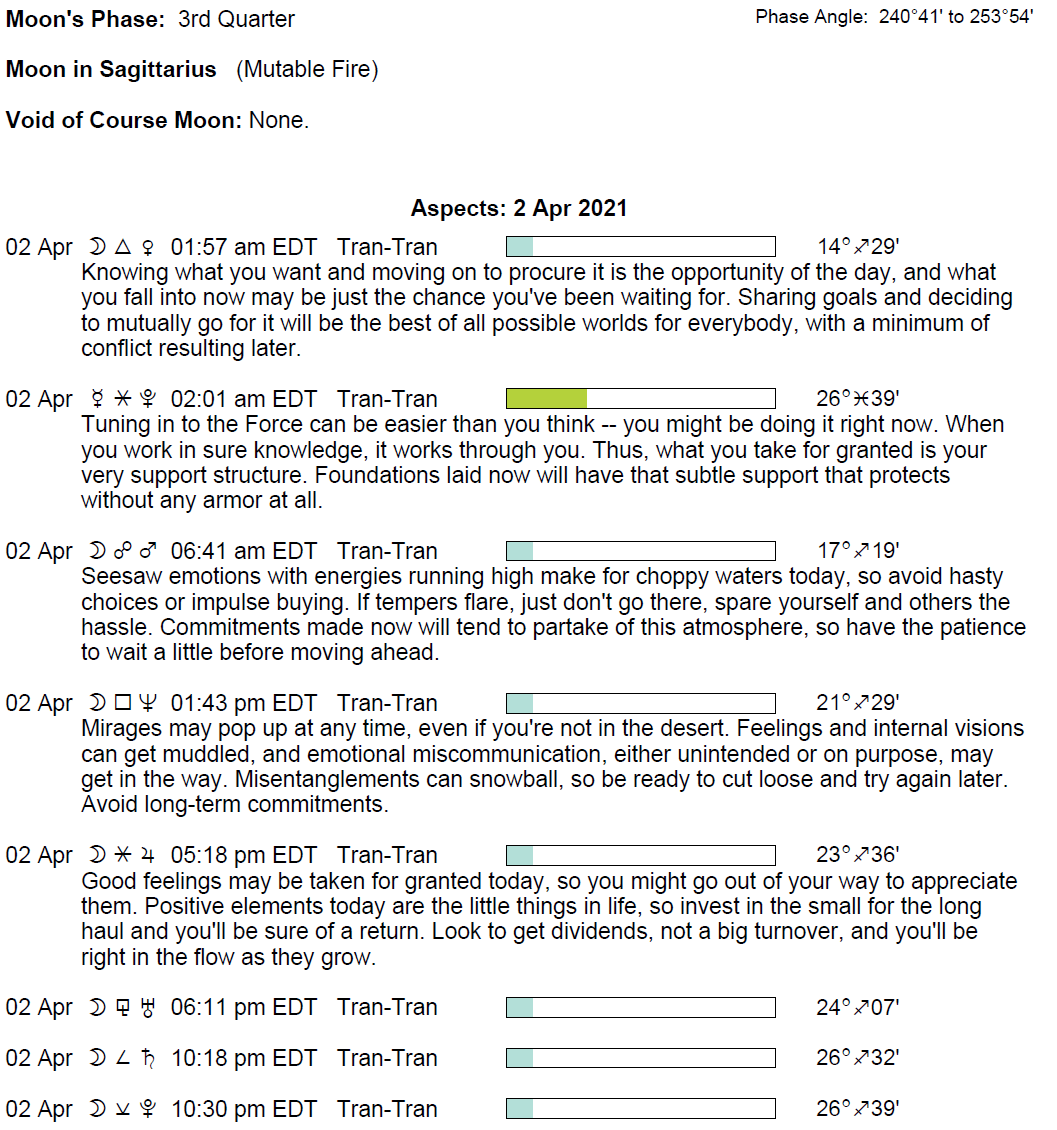Planet Color Key: The longer the bar, the slower the aspecting planet, and the longer the duration of the planet’s transit.