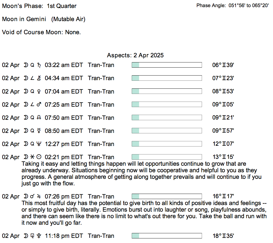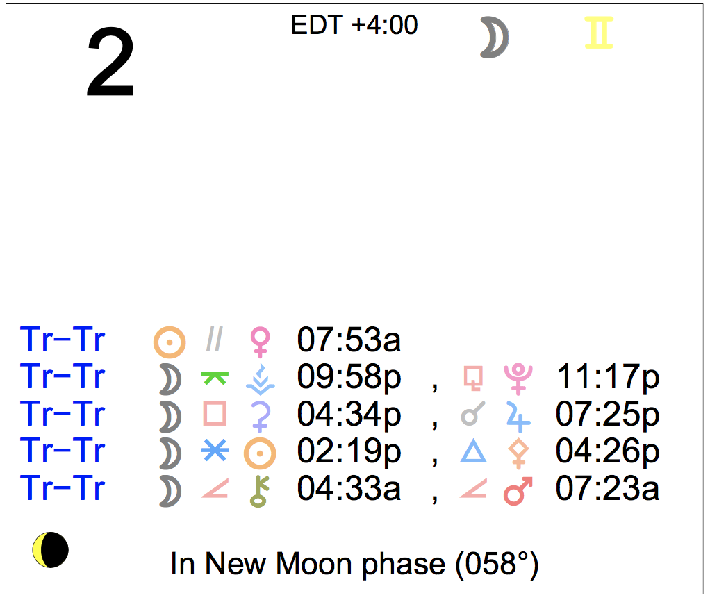 Planet Color Key: The longer the bar, the slower the aspecting planet, and the longer the duration of the planet’s transit.