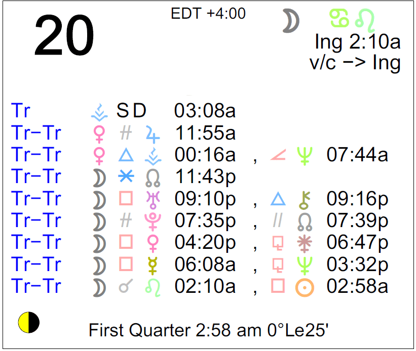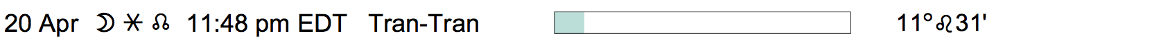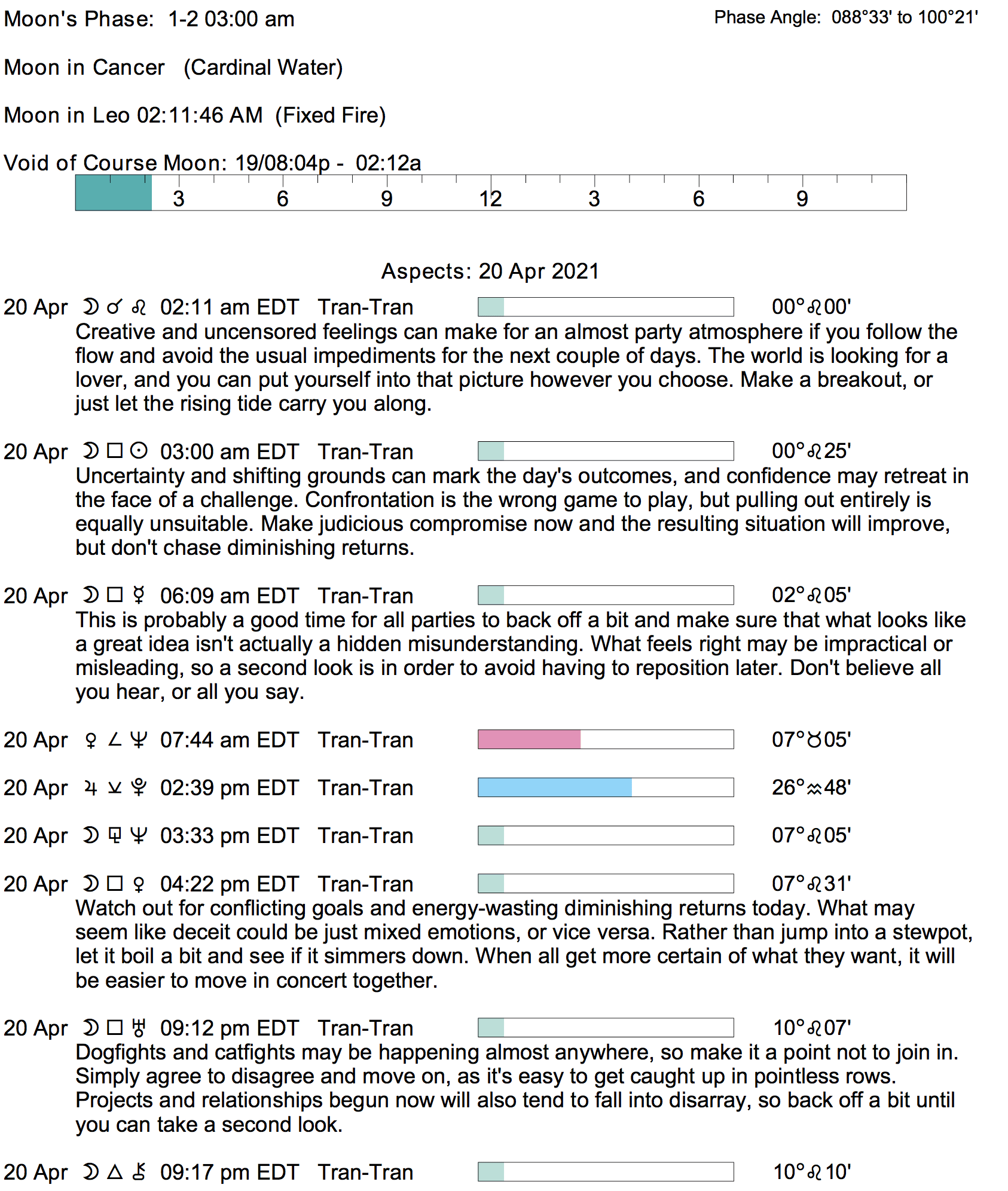 Planet Color Key: The longer the bar, the slower the aspecting planet, and the longer the duration of the planet’s transit.