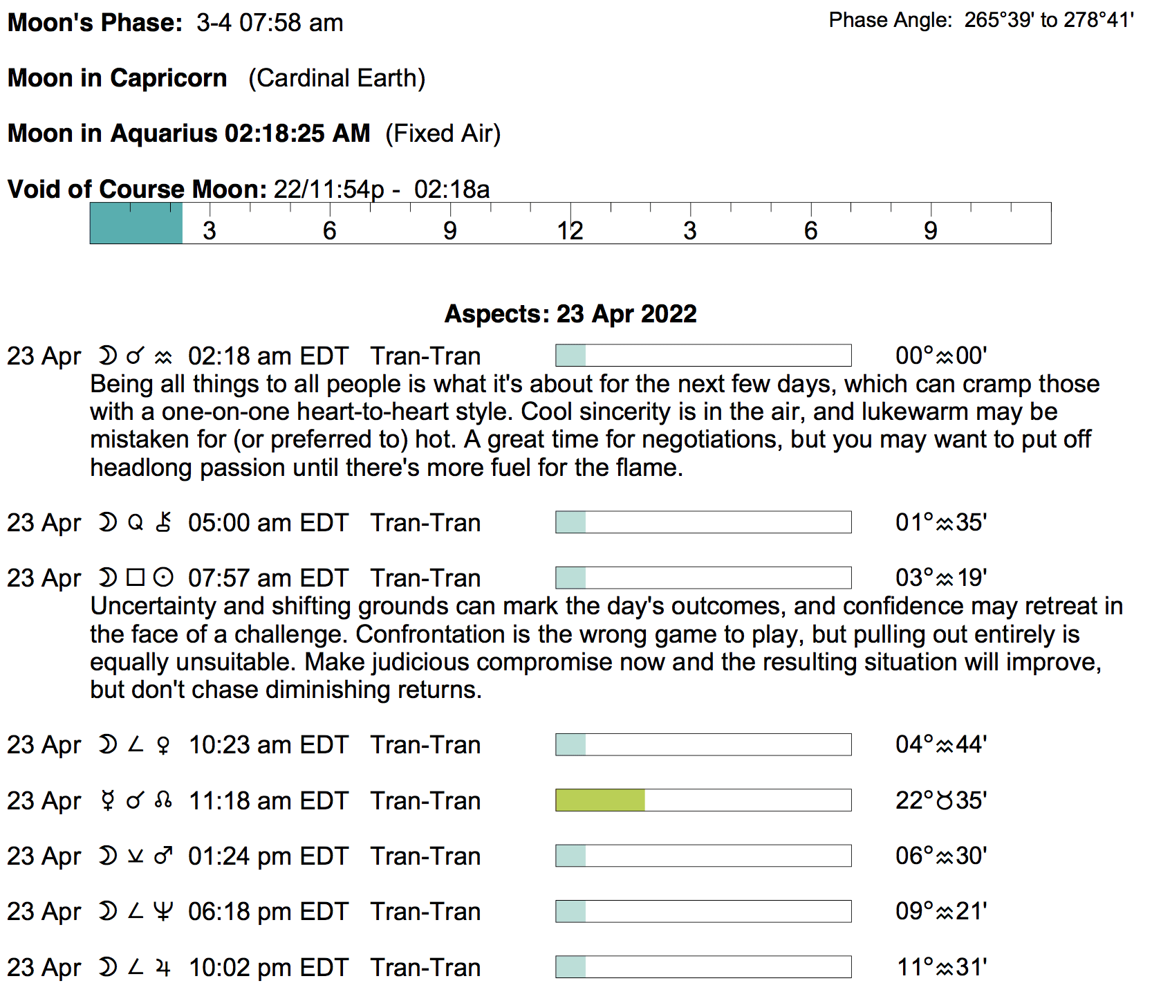 Planet Color Key: The longer the bar, the slower the aspecting planet, and the longer the duration of the planet’s transit.