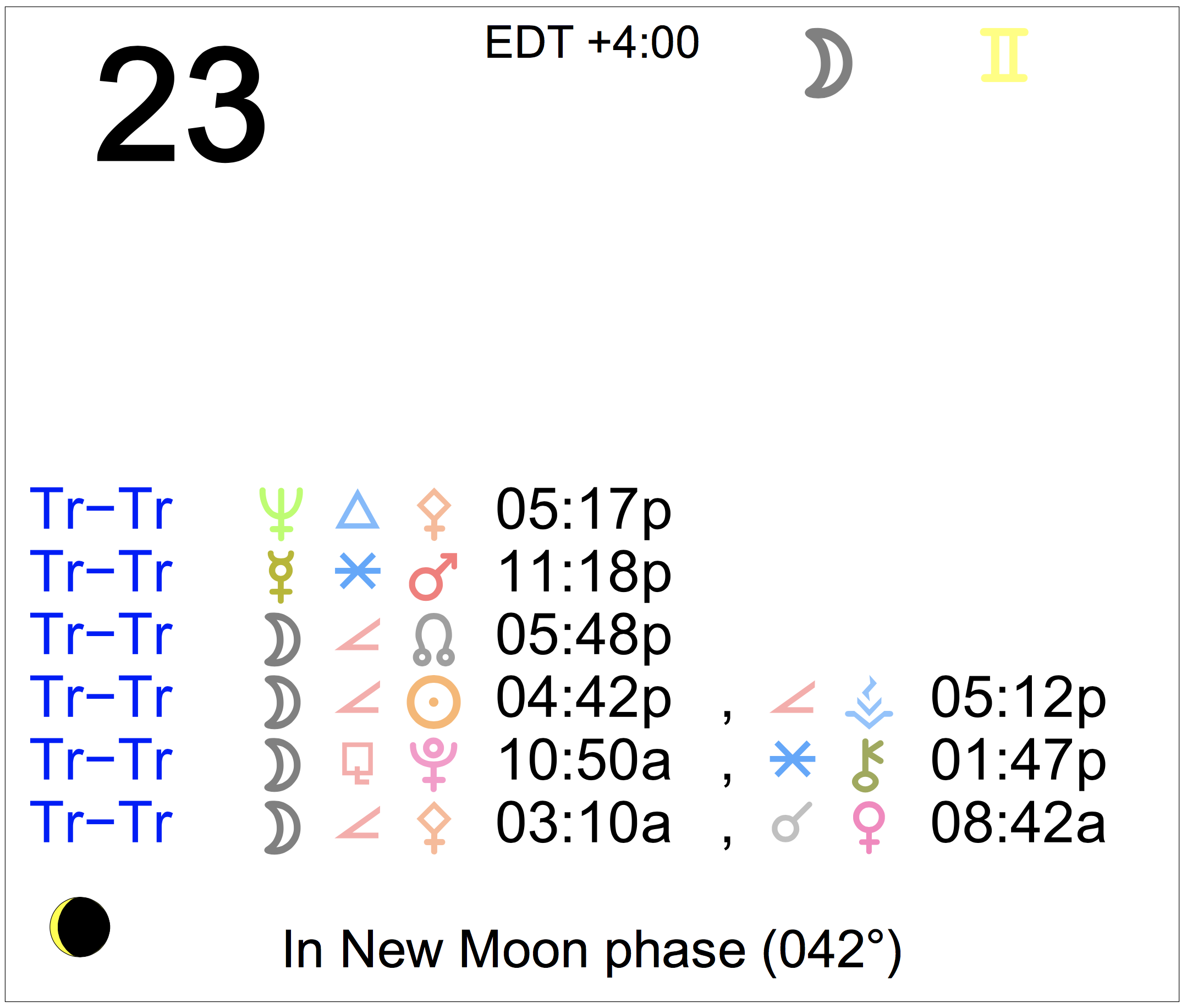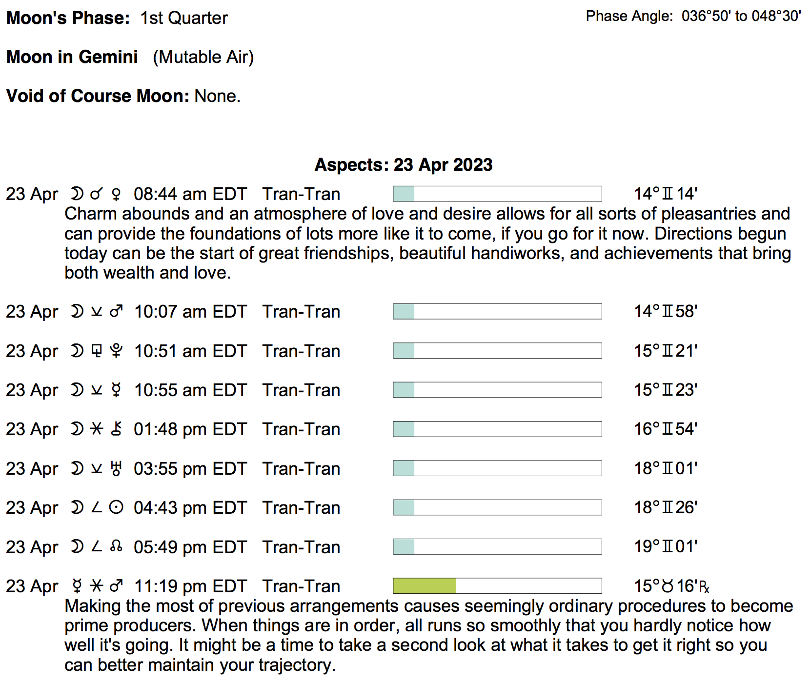Planet Color Key: The longer the bar, the slower the aspecting planet, and the longer the duration of the planet’s transit.