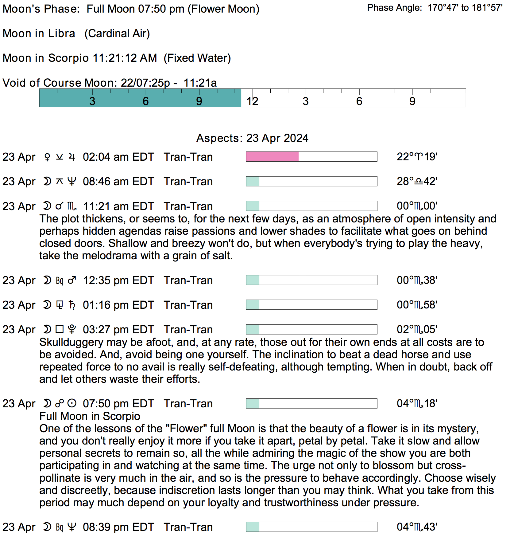 Planet Color Key: The longer the bar, the slower the aspecting planet, and the longer the duration of the planet’s transit.