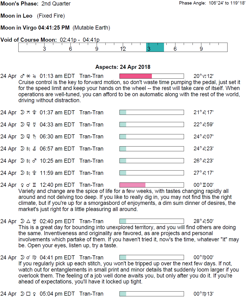 Planet Color Key: The longer the bar, the slower the aspecting planet and the longer the duration of the planet’s transit.