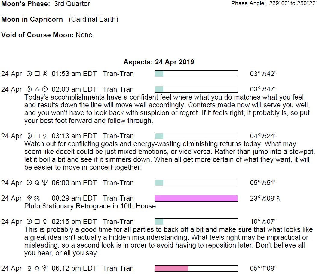 Planet Color Key: The longer the bar, the slower the aspecting planet and the longer the duration of the planet’s transit.