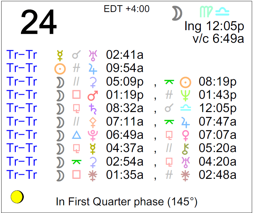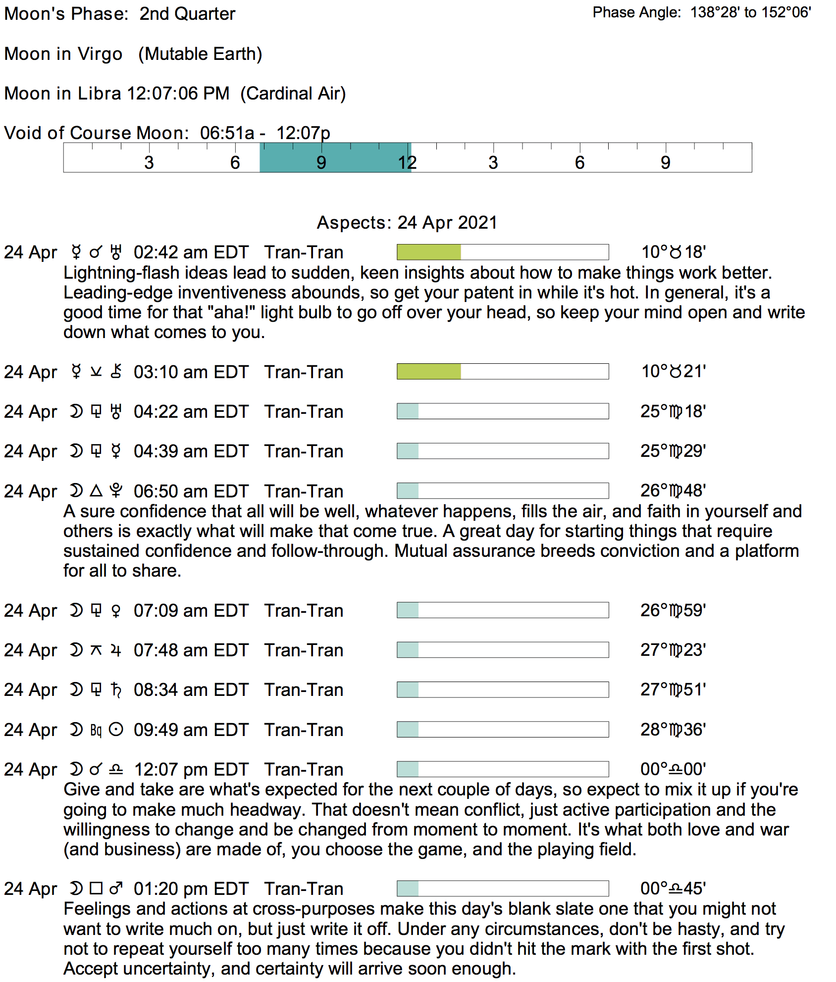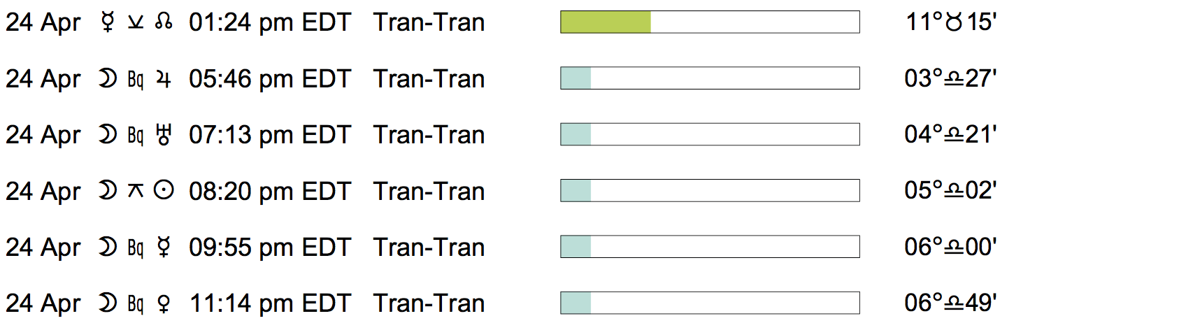 Planet Color Key: The longer the bar, the slower the aspecting planet, and the longer the duration of the planet’s transit.