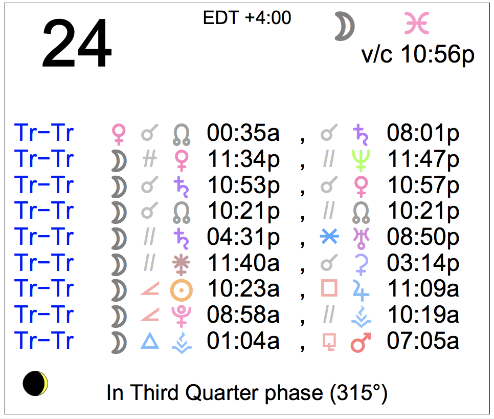 Planet Color Key: The longer the bar, the slower the aspecting planet, and the longer the duration of the planet’s transit.