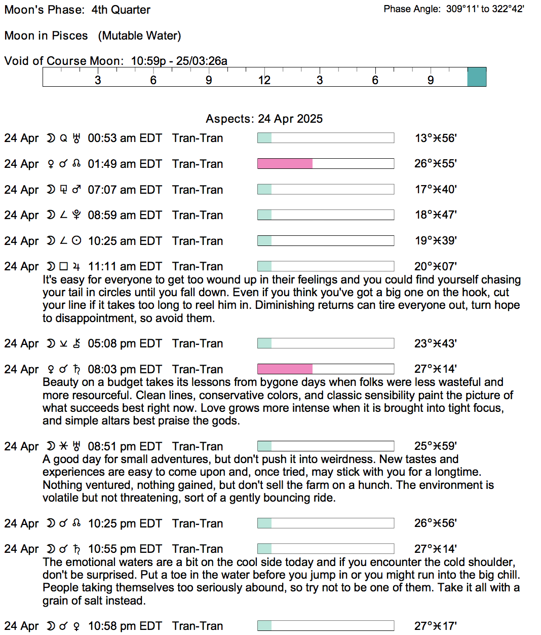 - A void Moon period begins tonight at 10:56 PM (this period continues until the Moon enters Aries tomorrow).