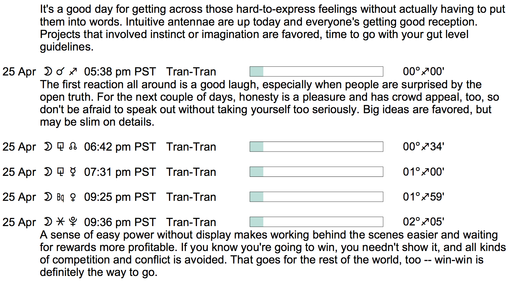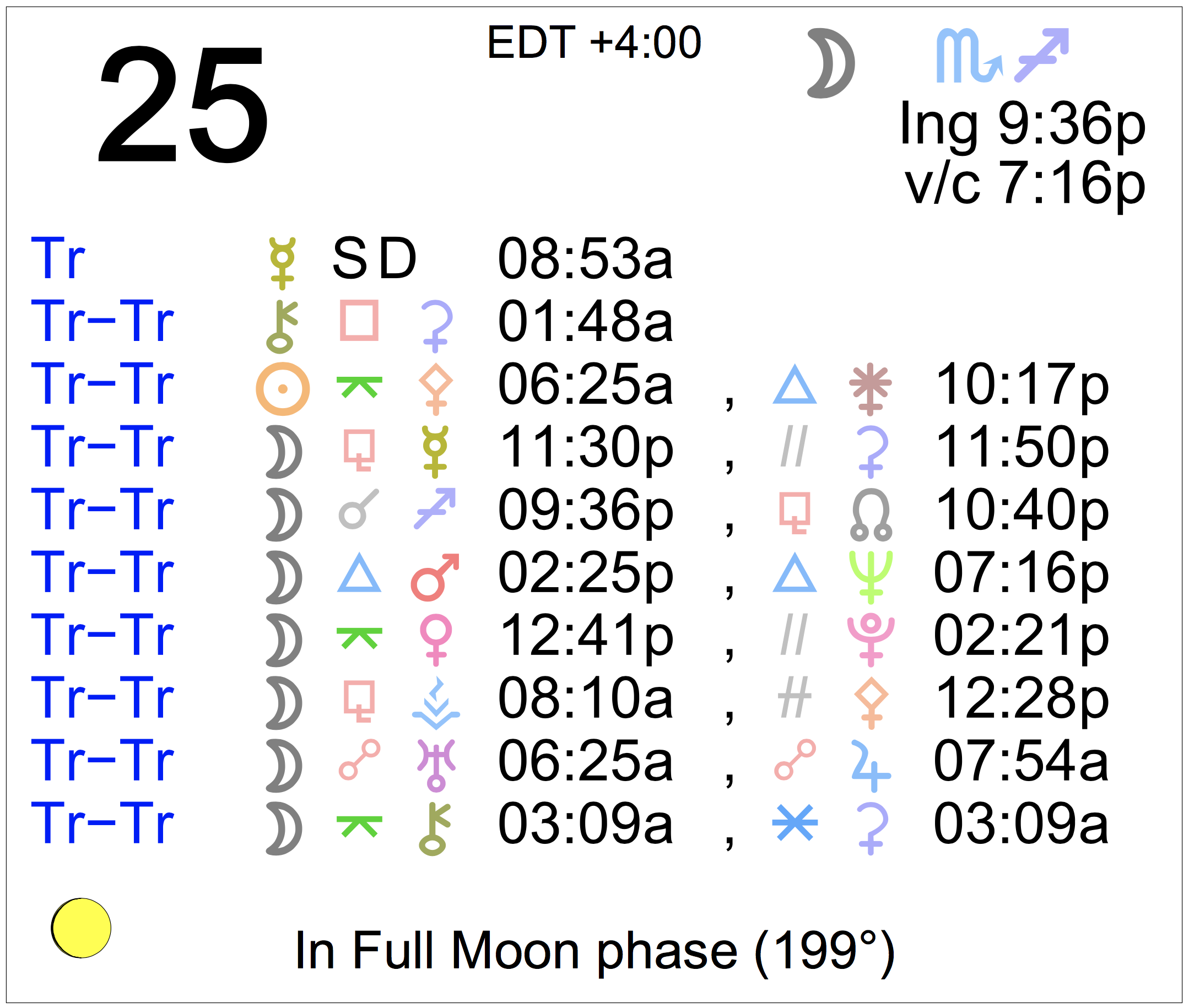 Planet Color Key: The longer the bar, the slower the aspecting planet, and the longer the duration of the planet’s transit.