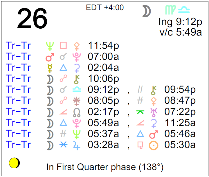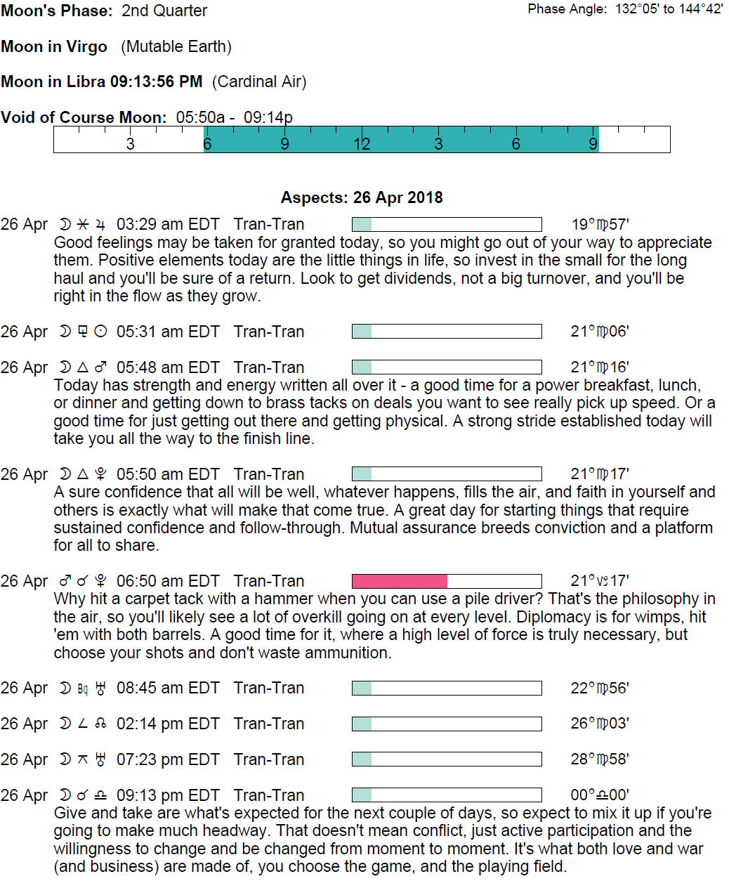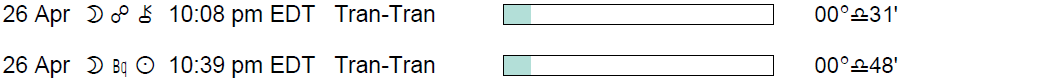 Planet Color Key: The longer the bar, the slower the aspecting planet and the longer the duration of the planet’s transit.