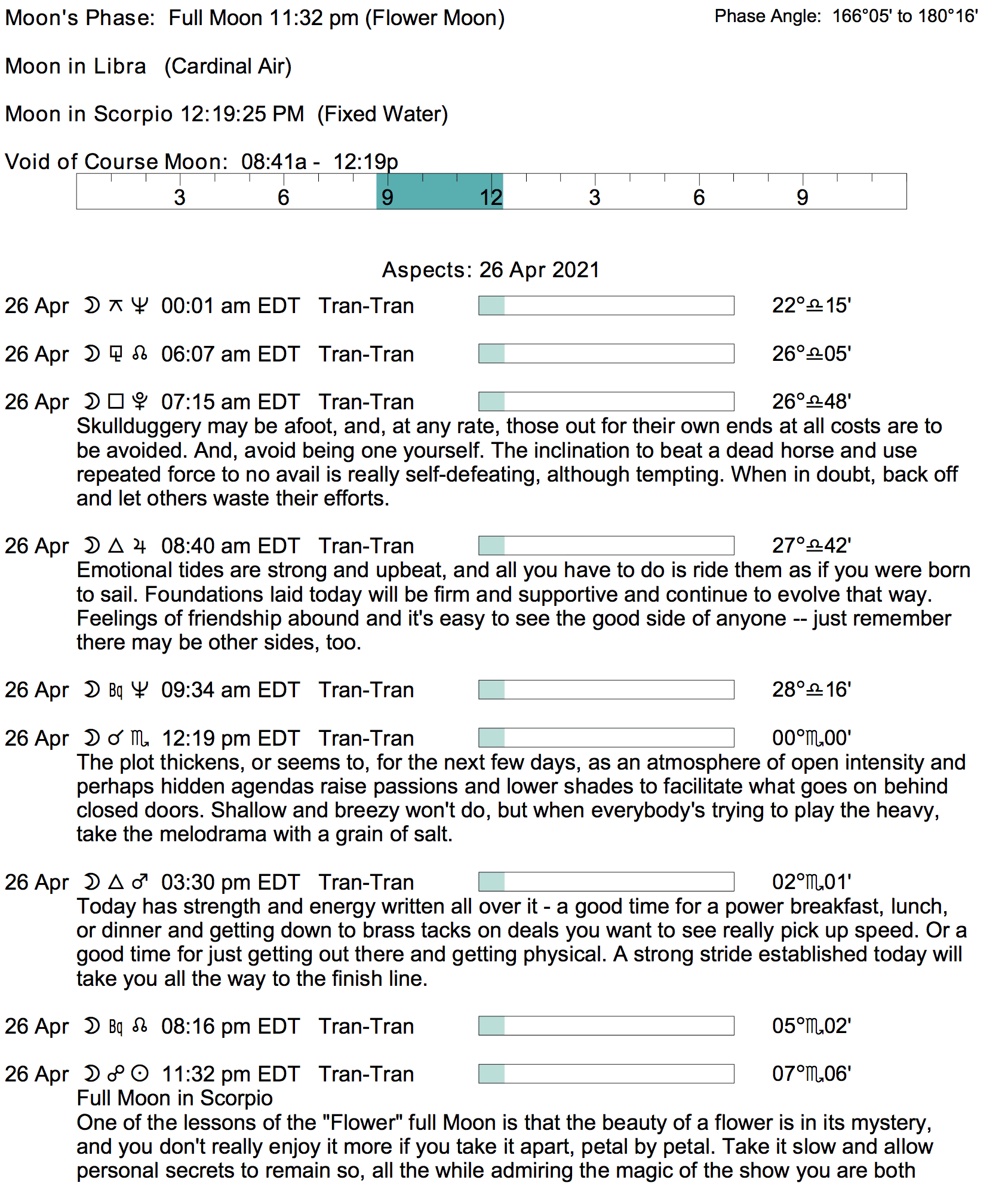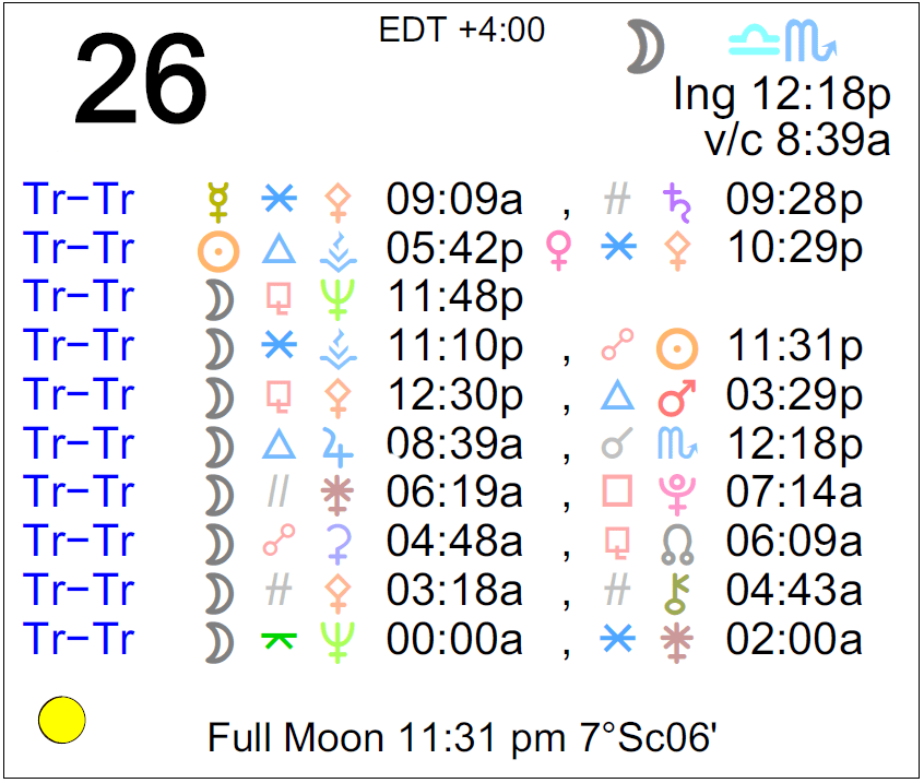 - The Full Moon occurs today in the sign of Scorpio at 11:31 PM.