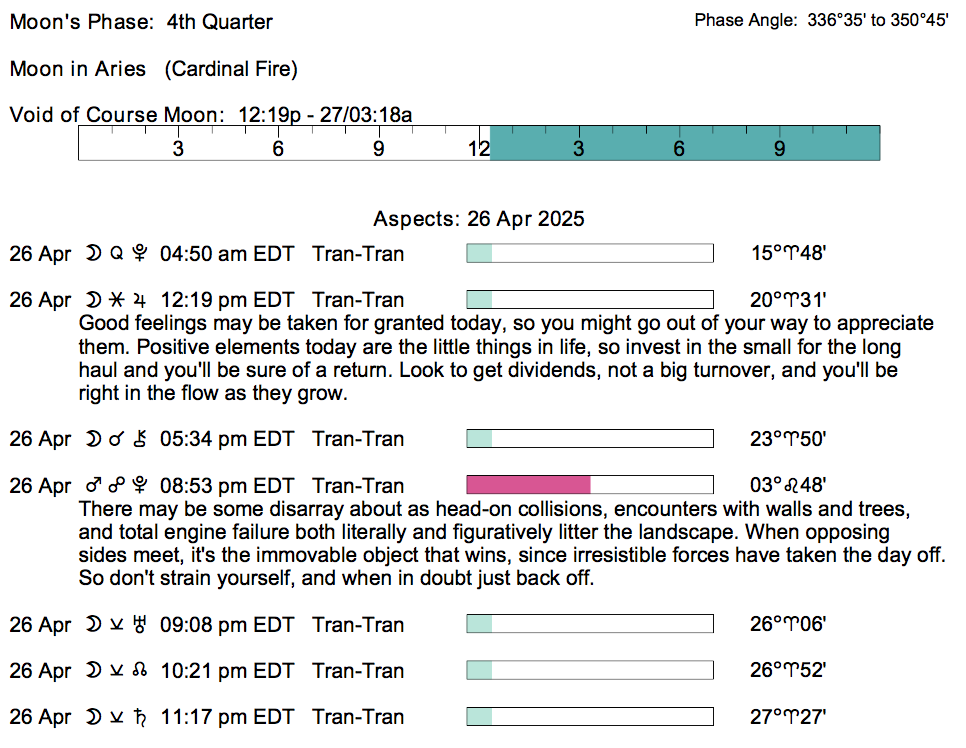 Planet Color Key: The longer the bar, the slower the aspecting planet, and the longer the duration of the planet’s transit.