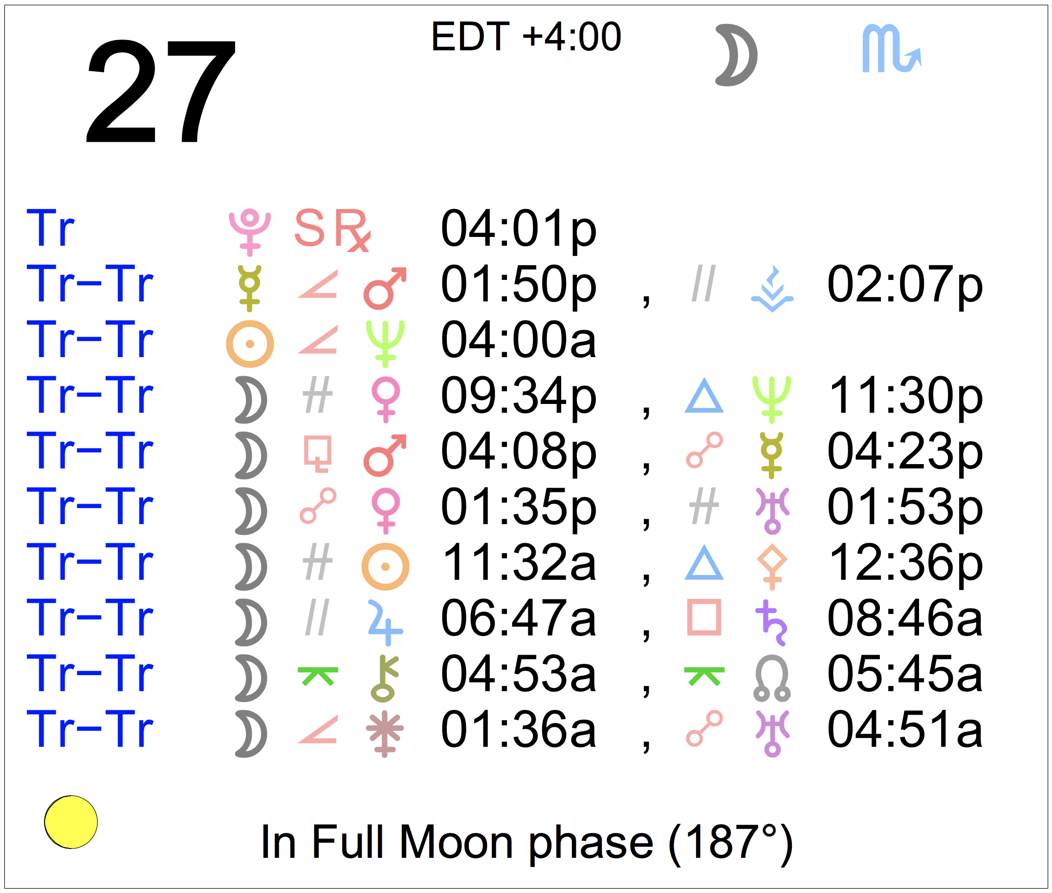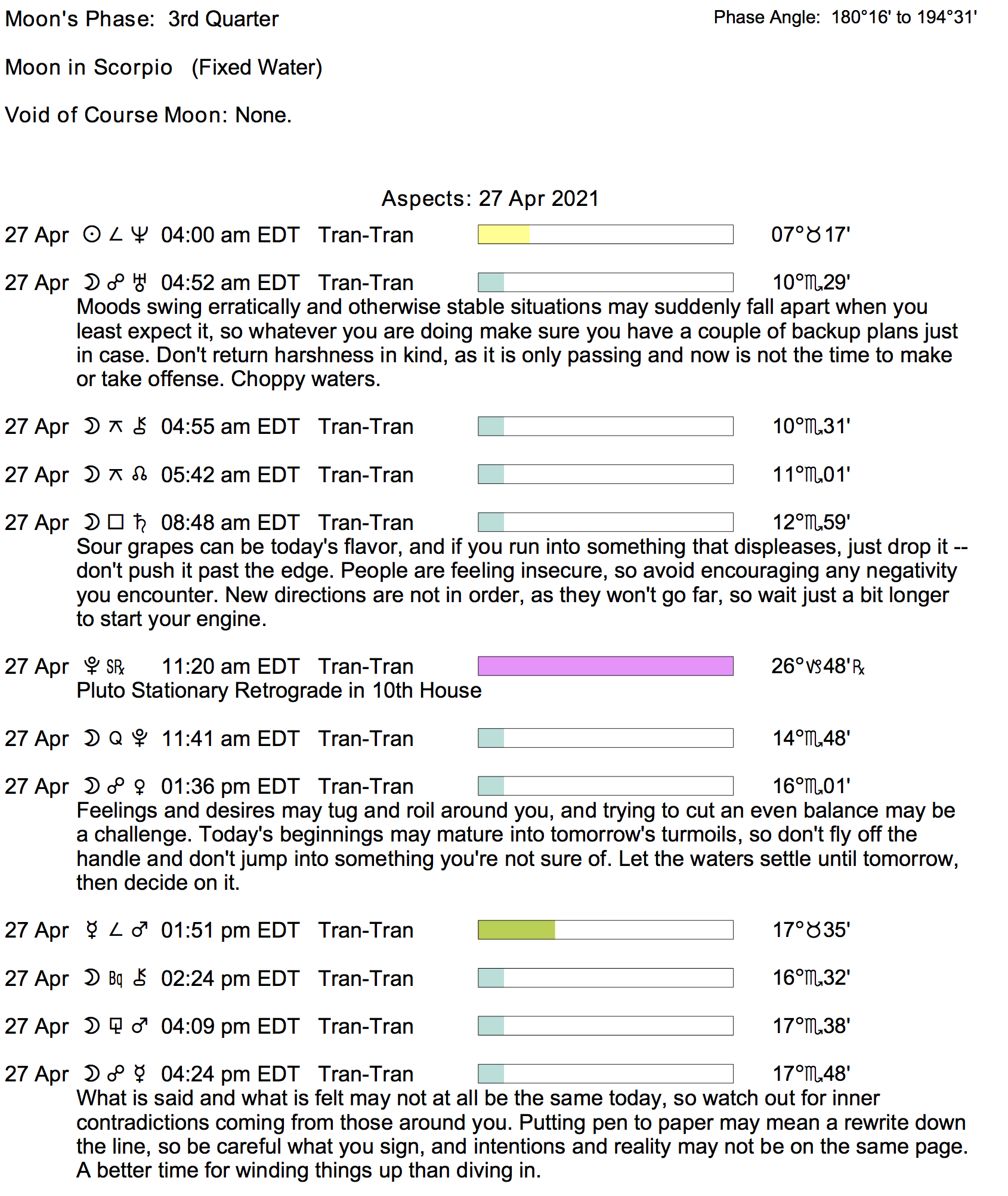 Planet Color Key: The longer the bar, the slower the aspecting planet, and the longer the duration of the planet’s transit.
