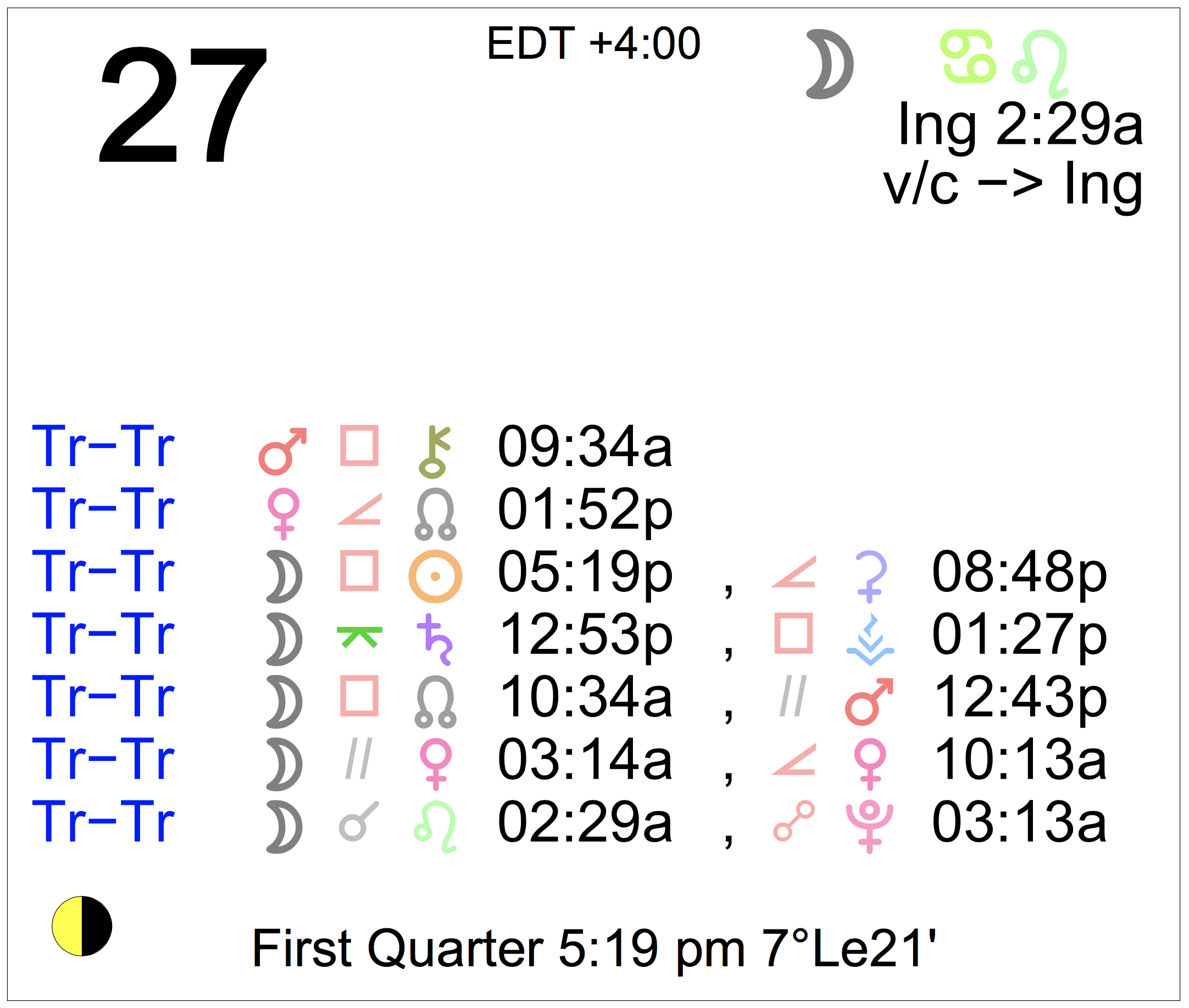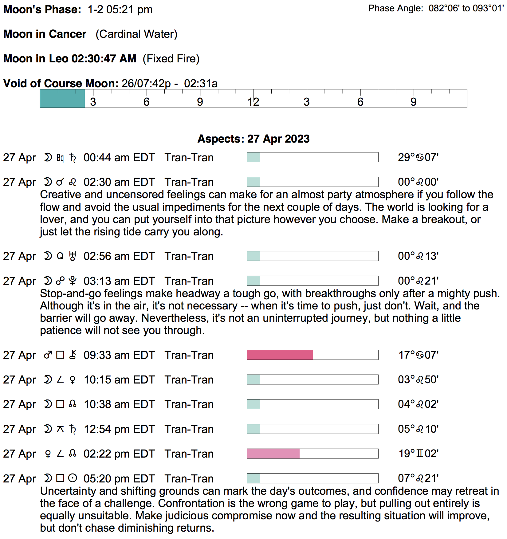 Planet Color Key: The longer the bar, the slower the aspecting planet, and the longer the duration of the planet’s transit.