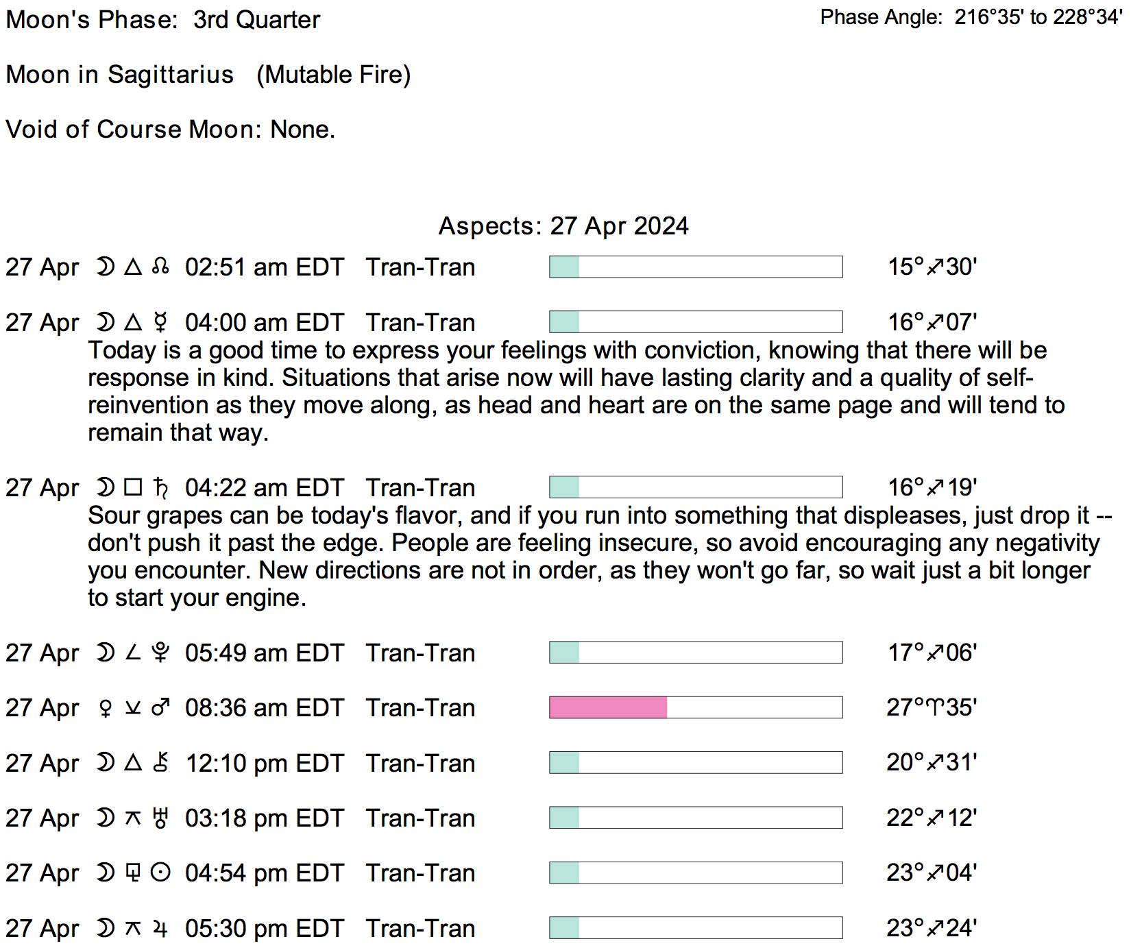 Planet Color Key: The longer the bar, the slower the aspecting planet, and the longer the duration of the planet’s transit.
