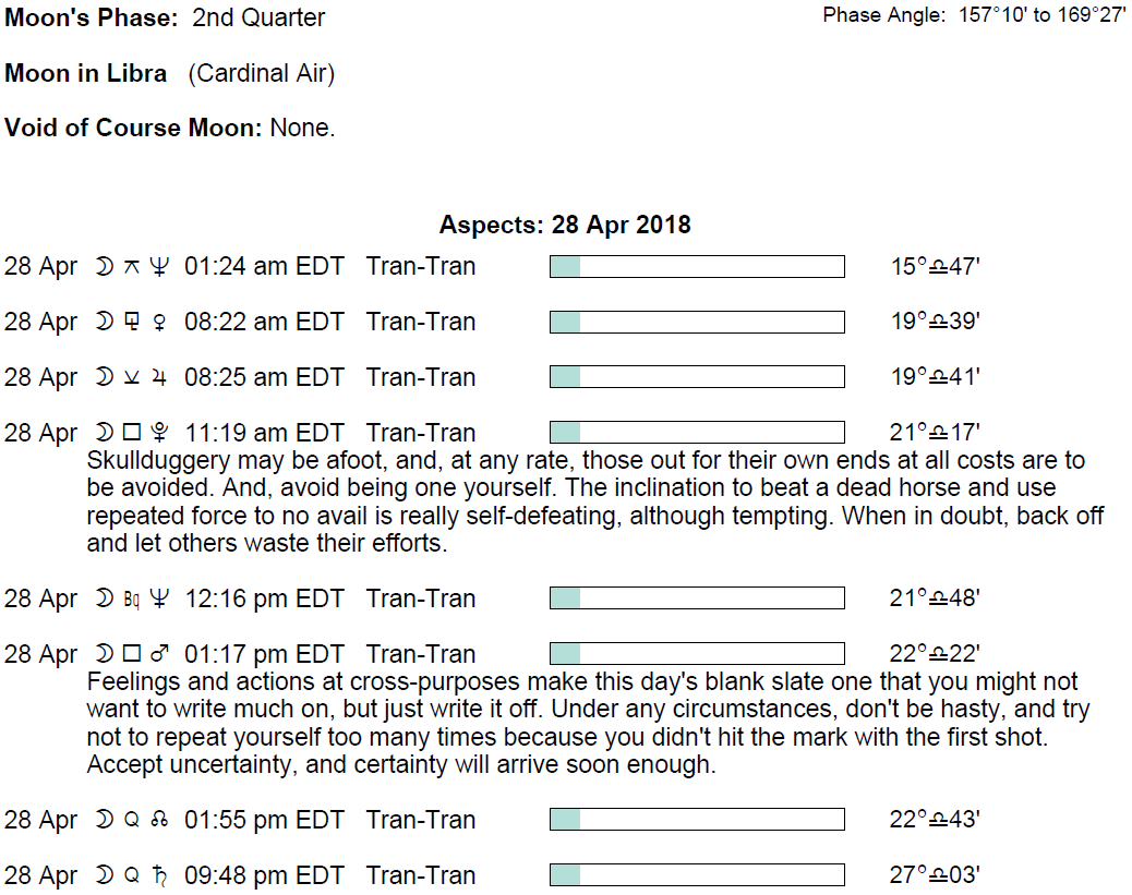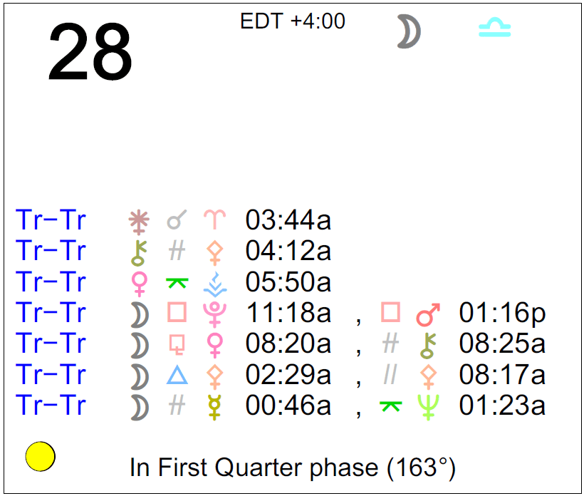 The following aspects (major only) and positions are at noon (EDT) on April 28th: