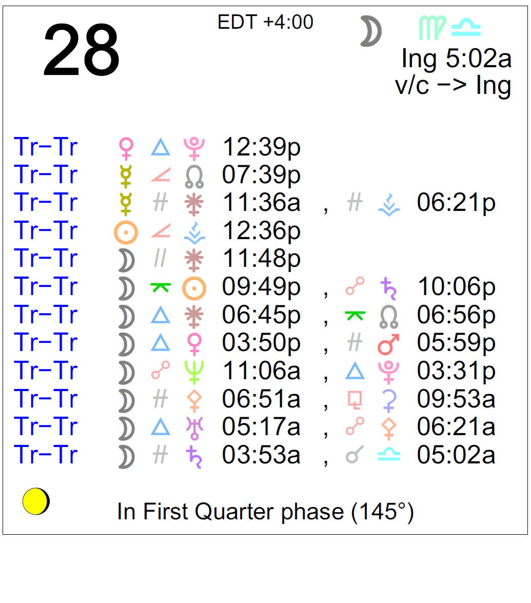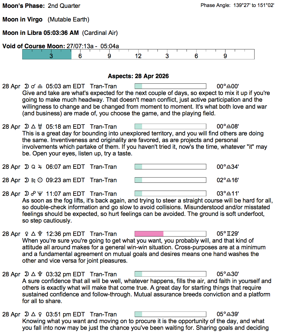 Planet Color Key: The longer the bar, the slower the aspecting planet, and the longer the duration of the planet’s transit.