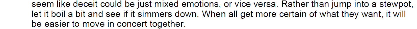 We may have some difficulty letting go of hurt feelings or resentments. We can be sensitive to what others think of us, and decisions made now may not reflect our hearts, and can be regrettable later on. We might take things the wrong way due to sensitivity. We may not make efforts to be understood. Hurt feelings are opportunities for healing. Now is the time for building bridges, not burning them.