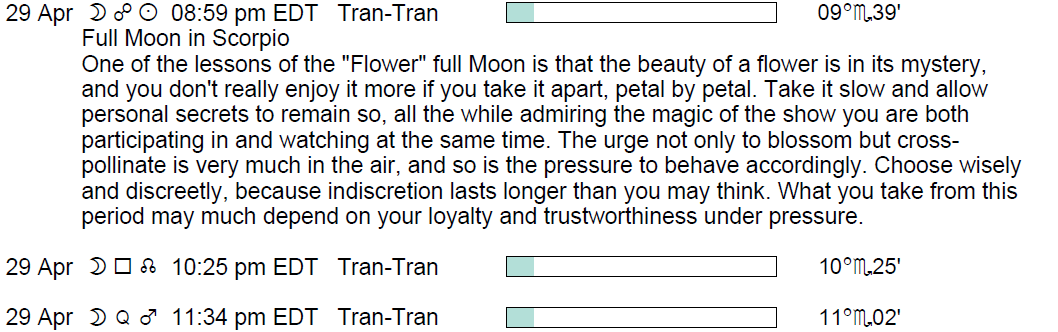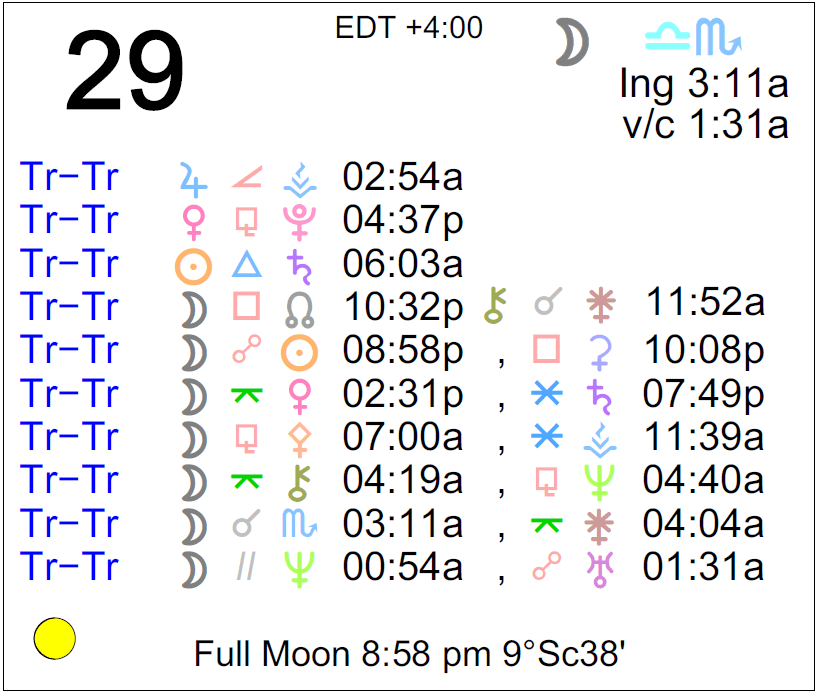 - The Full Moon occurs today in the sign of Scorpio at 8:58 PM.