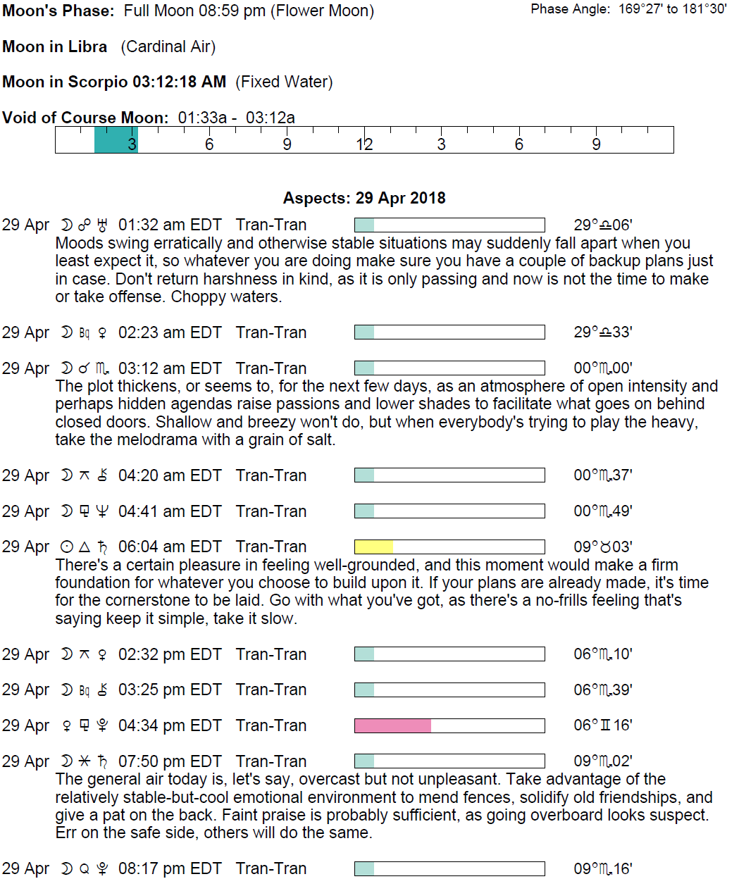 Planet Color Key: The longer the bar, the slower the aspecting planet and the longer the duration of the planet’s transit.