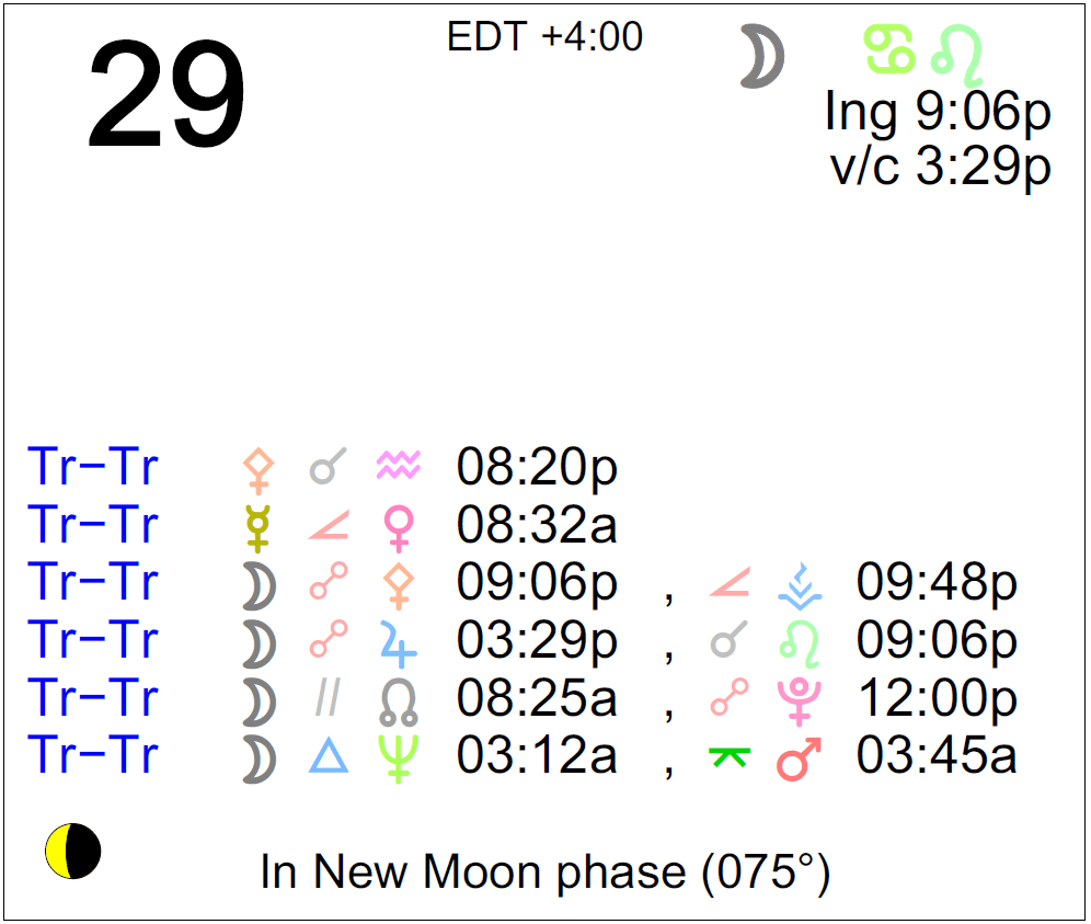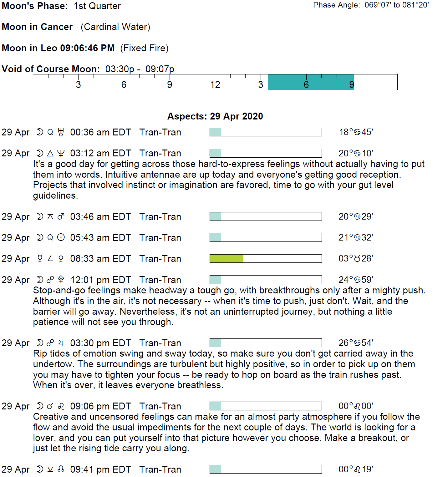 - The void Moon occurs today from 3:29 PM to 9:06 PM.