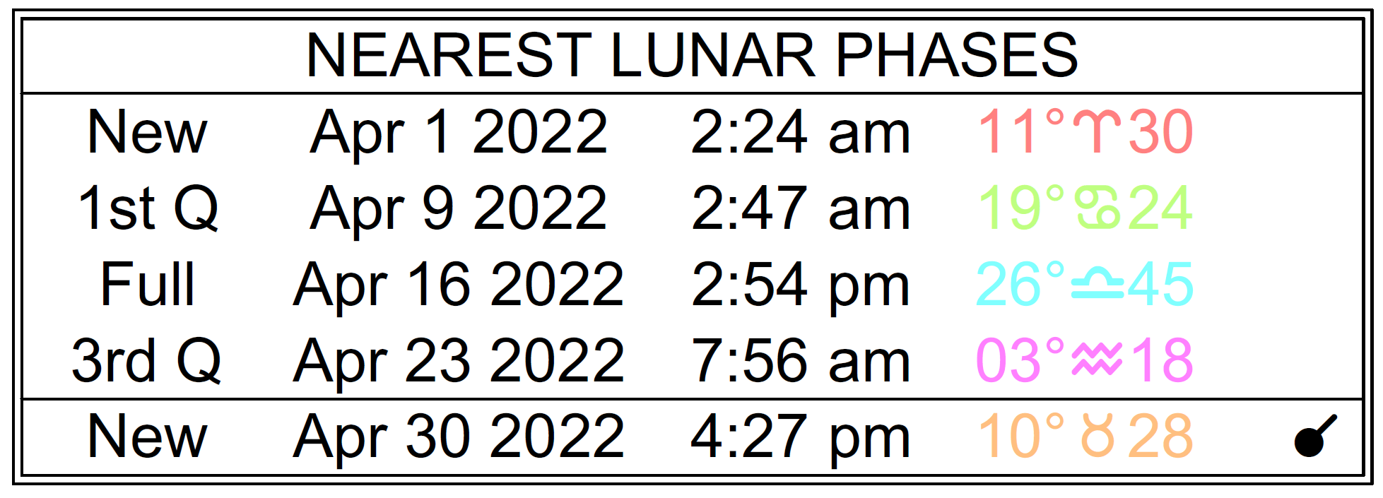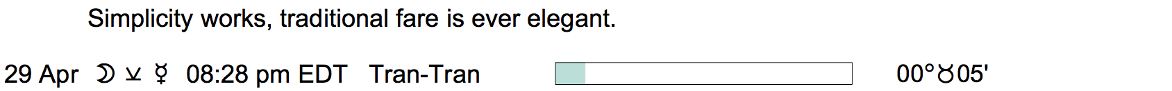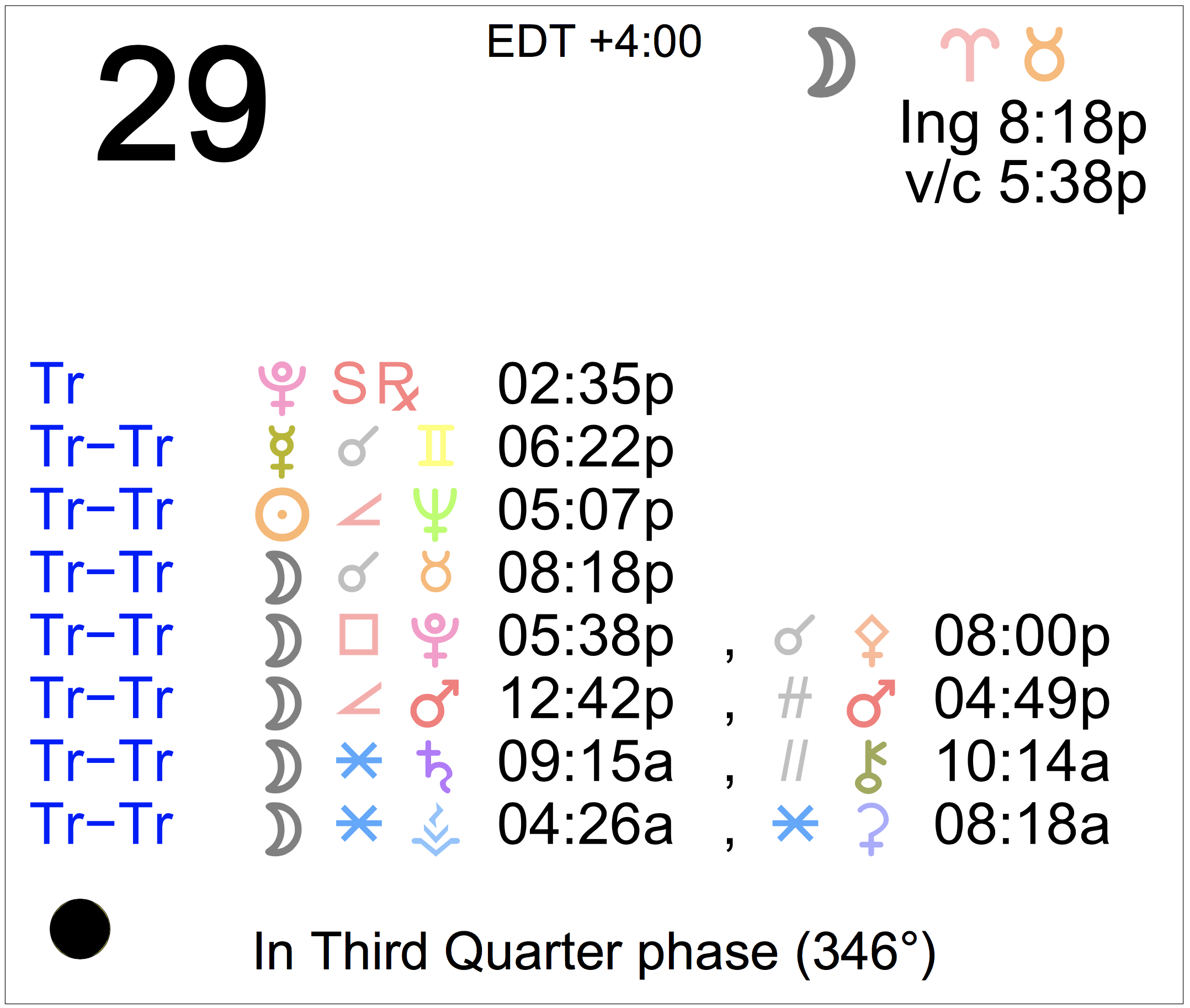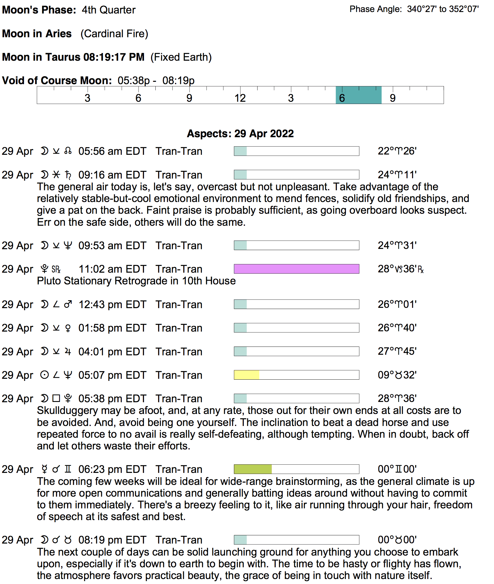 Planet Color Key: The longer the bar, the slower the aspecting planet, and the longer the duration of the planet’s transit.