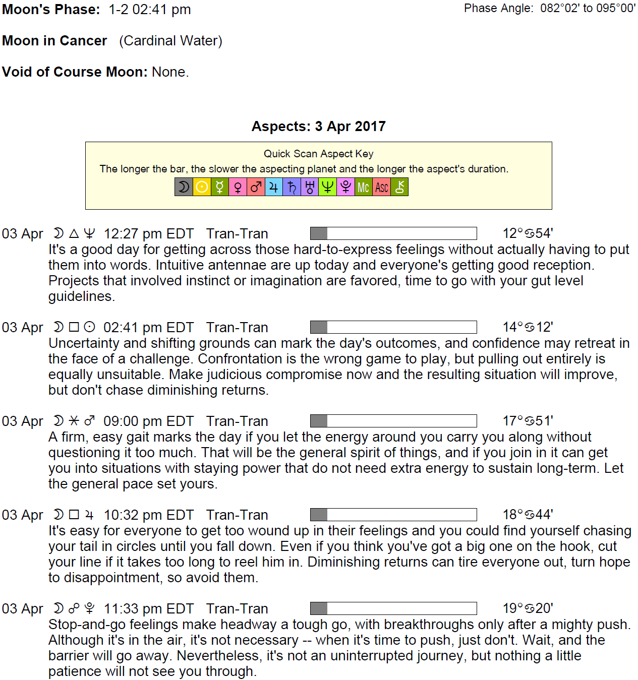 Note that the Moon moves at a rate of approximately one degree every 2 hours, so that if an aspect involving the Moon is applying and has an orb of 5 degrees, the aspect will perfect (be exact) in about 10 hours. If the Moon is separating from an aspect with an orb of 2 degrees, it has already formed said aspect approximately 4 hours ago (since the following are positions at noon today, then it would have occurred at about 8 AM today).