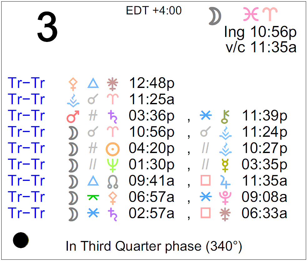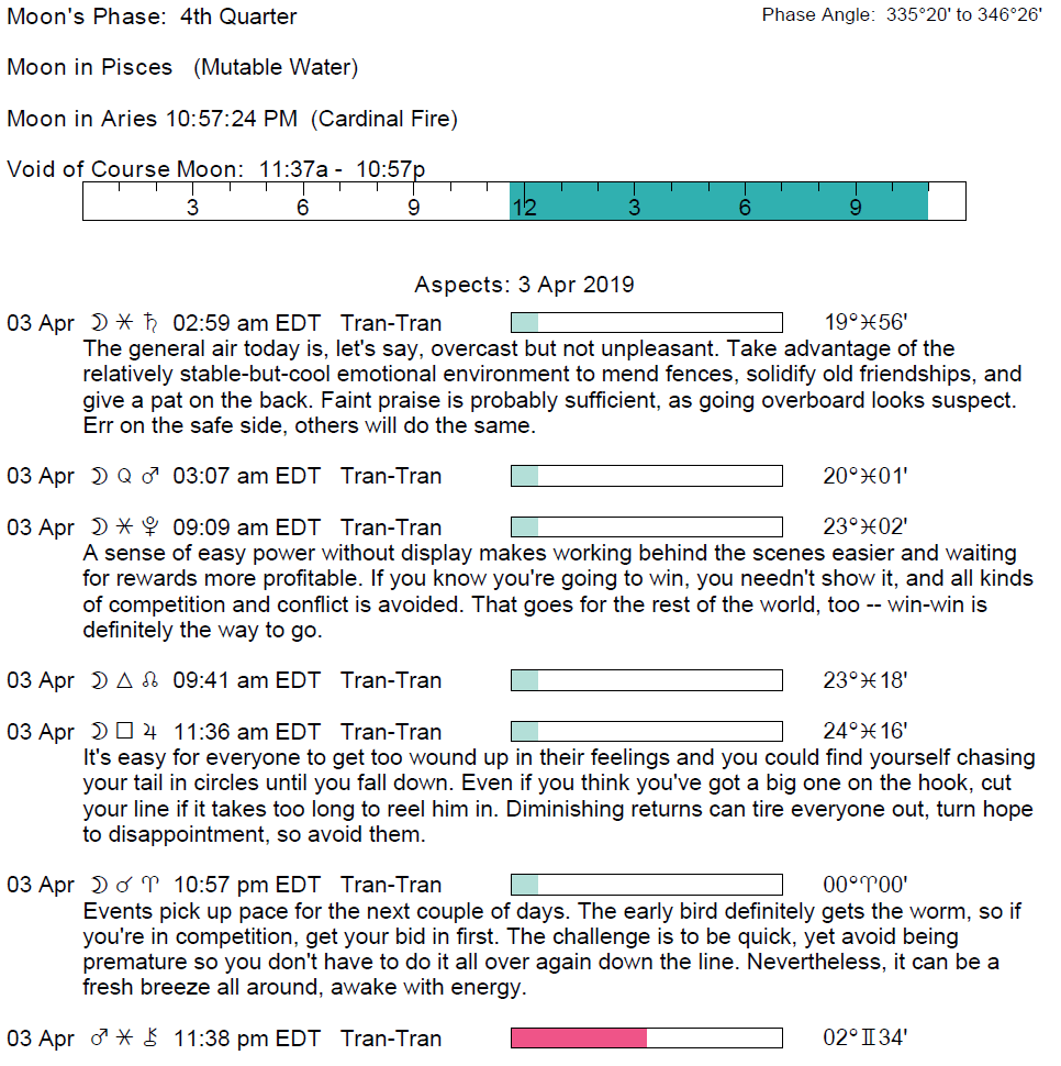 Planet Color Key: The longer the bar, the slower the aspecting planet and the longer the duration of the planet’s transit.