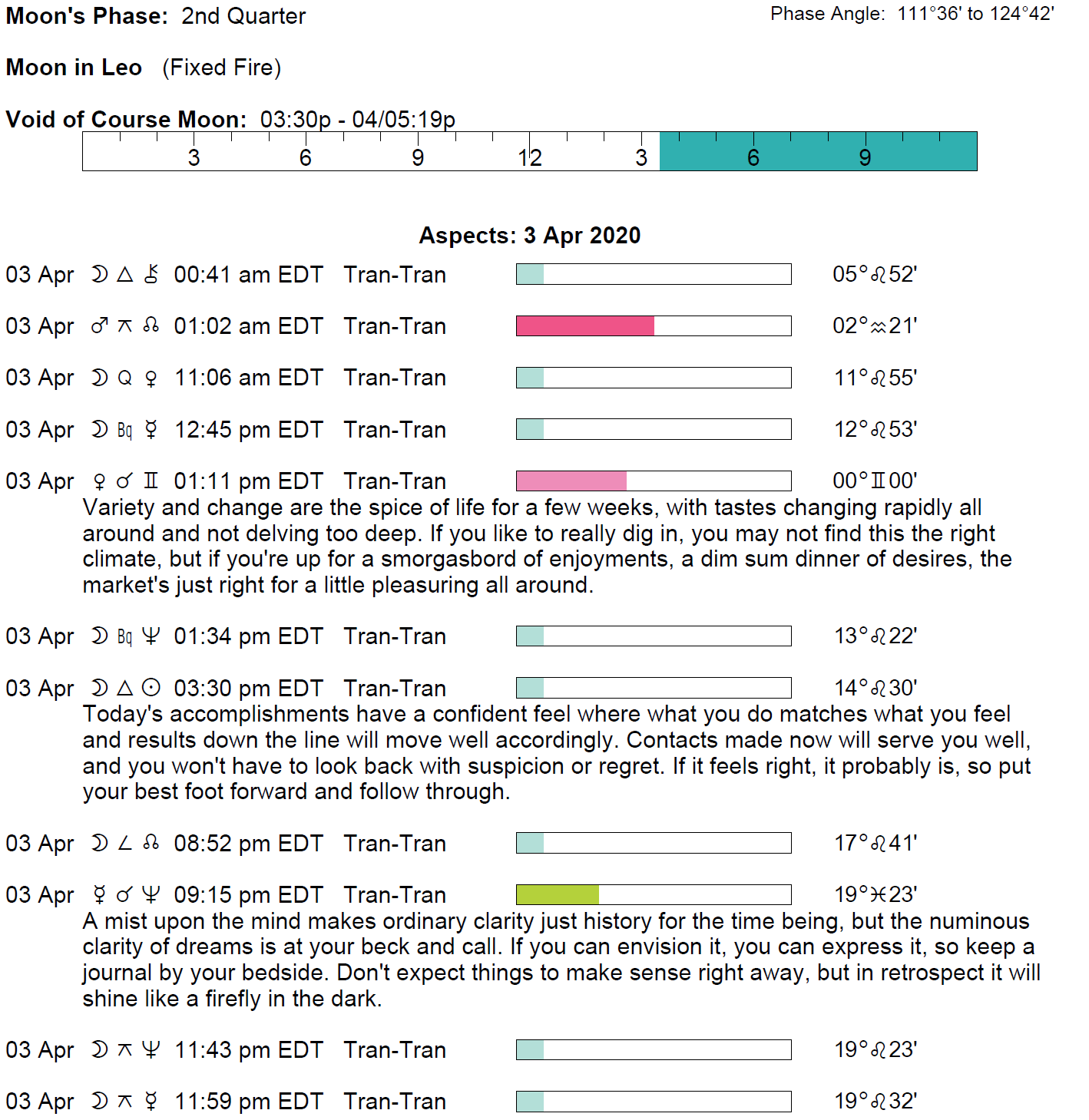 Planet Color Key: The longer the bar, the slower the aspecting planet and the longer the duration of the planet’s transit.
