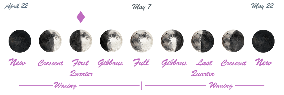 - The Moon is waxing and in its Waxing Crescent phase until 4:38 PM, after which the Moon is in its First Quarter phase.