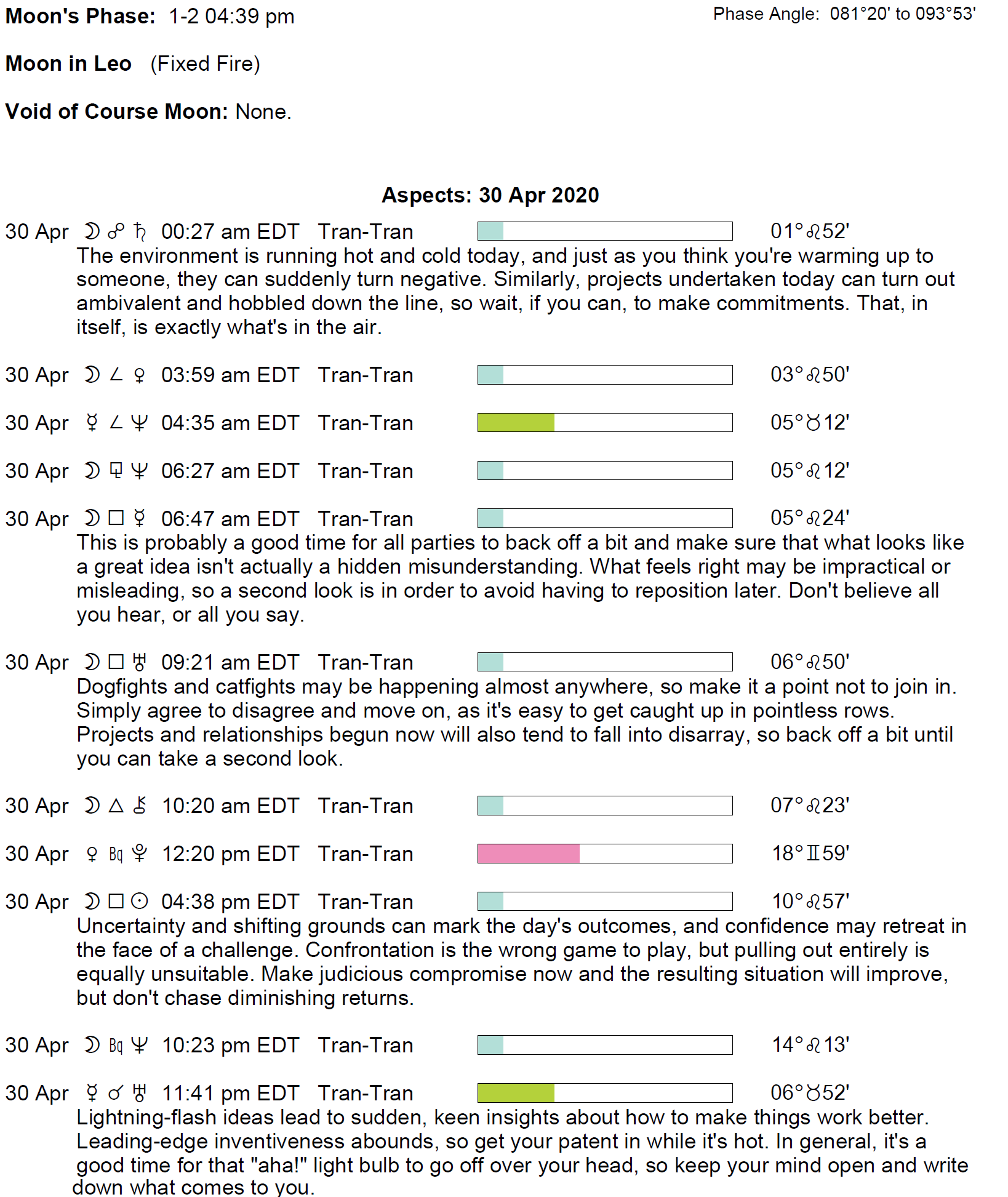 Planet Color Key: The longer the bar, the slower the aspecting planet and the longer the duration of the planet’s transit.