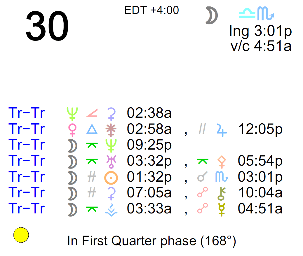 - A First Quarter Moon occurred on the 23rd, and the Full Moon will occur in Scorpio tomorrow.