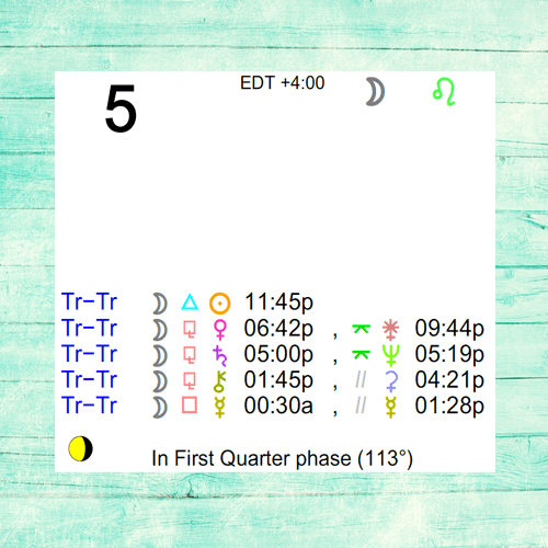 Note that the Moon moves at a rate of approximately one degree every 2 hours, so that if an aspect involving the Moon is applying and has an orb of 5 degrees, the aspect will perfect (be exact) in about 10 hours. If the Moon is separating from an aspect with an orb of 2 degrees, it has already formed said aspect approximately 4 hours ago (since the following are positions at noon today, then it would have occurred at about 8 AM today).