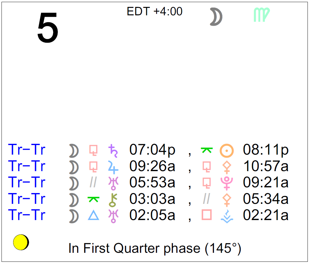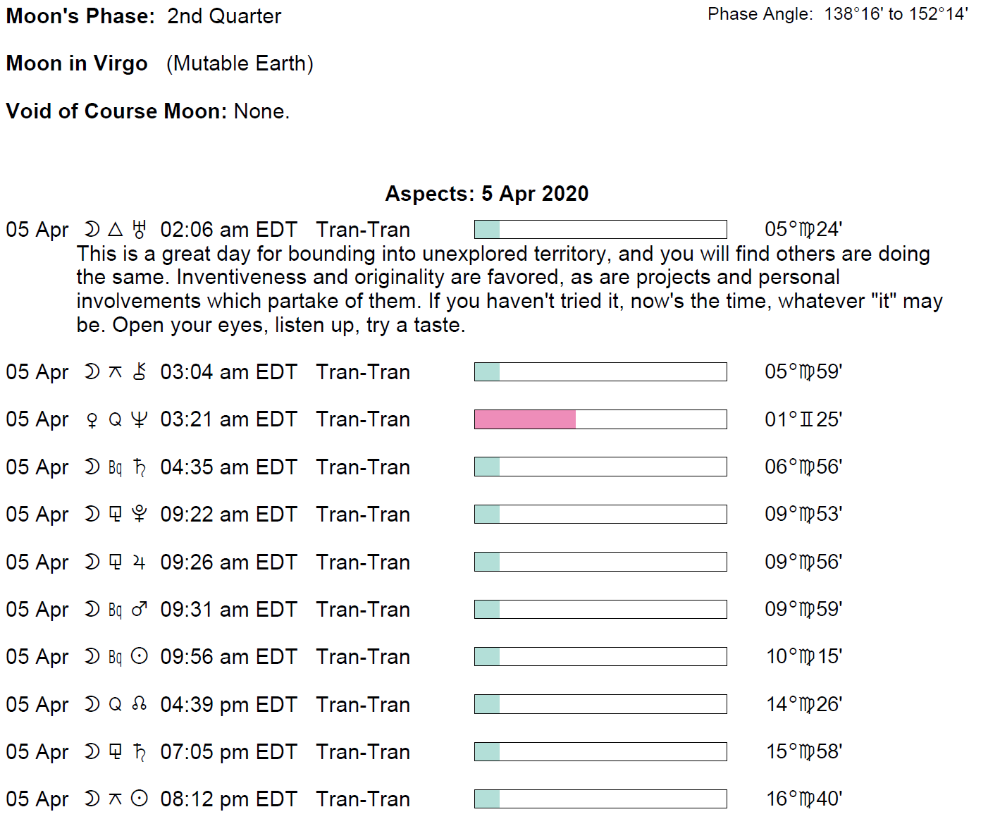 Planet Color Key: The longer the bar, the slower the aspecting planet and the longer the duration of the planet’s transit.