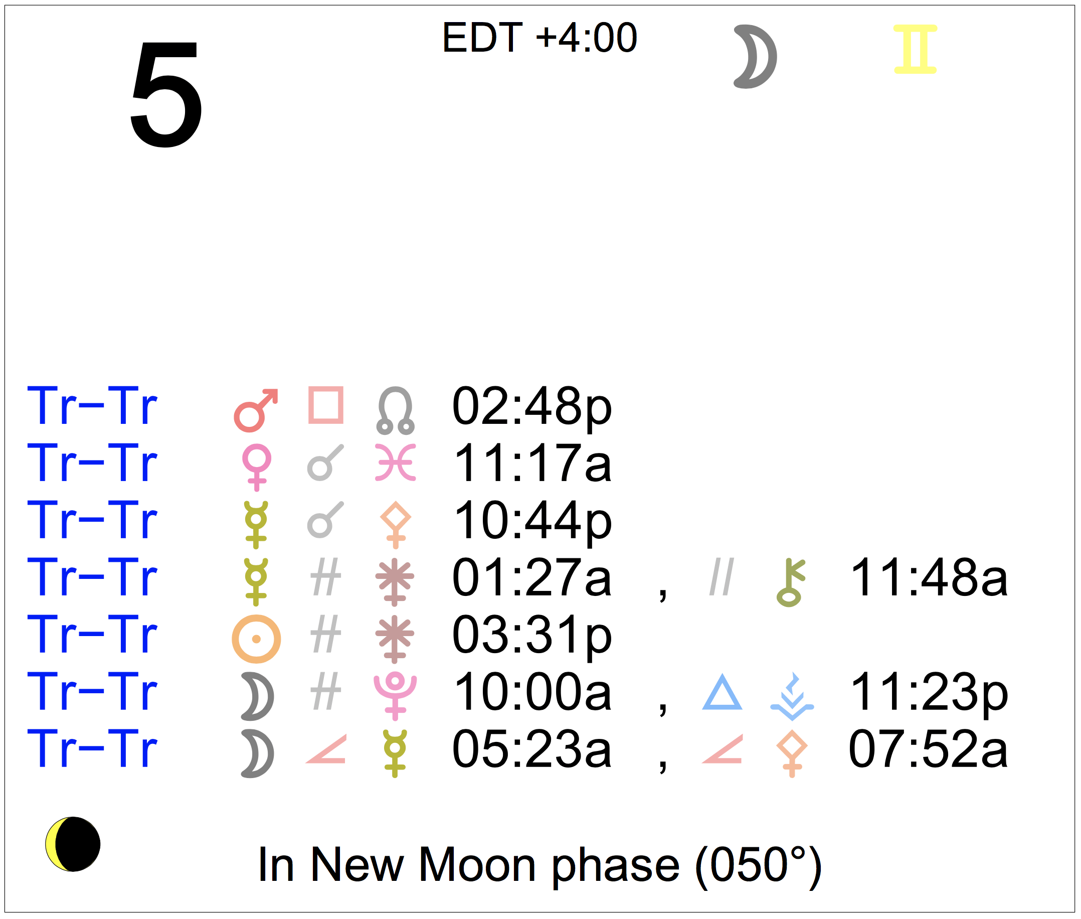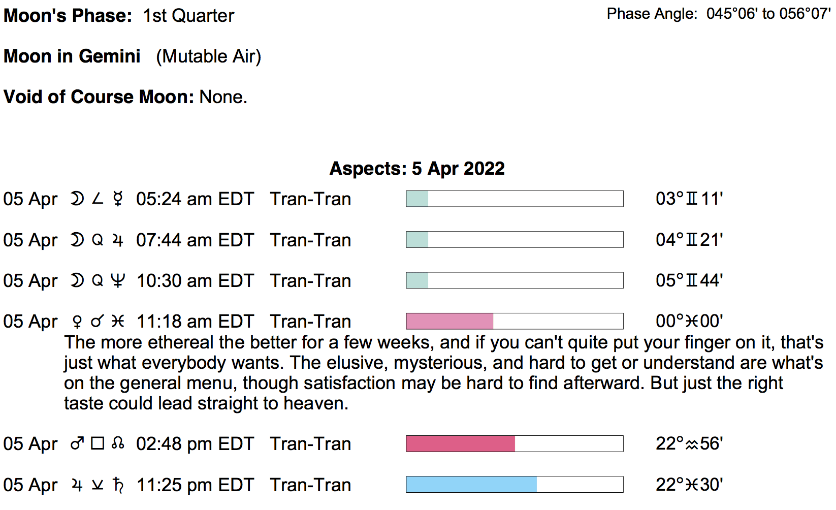 Planet Color Key: The longer the bar, the slower the aspecting planet, and the longer the duration of the planet’s transit.