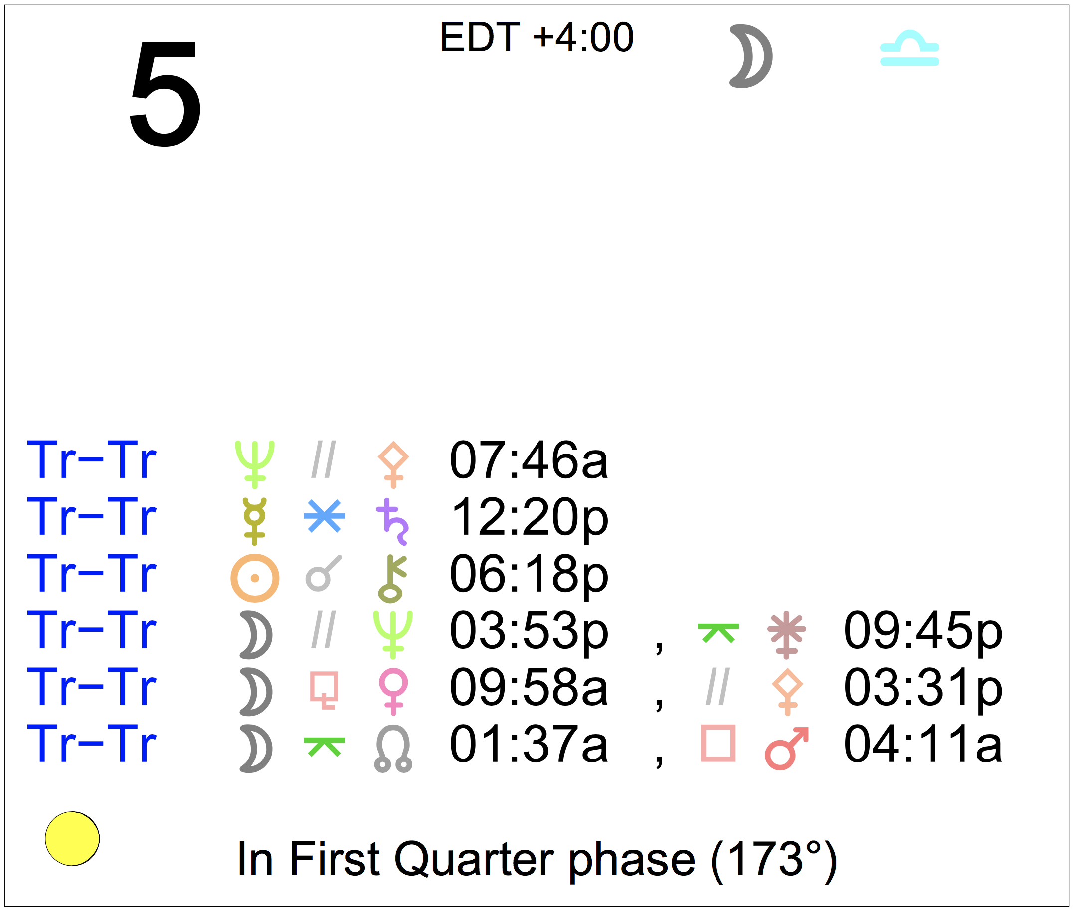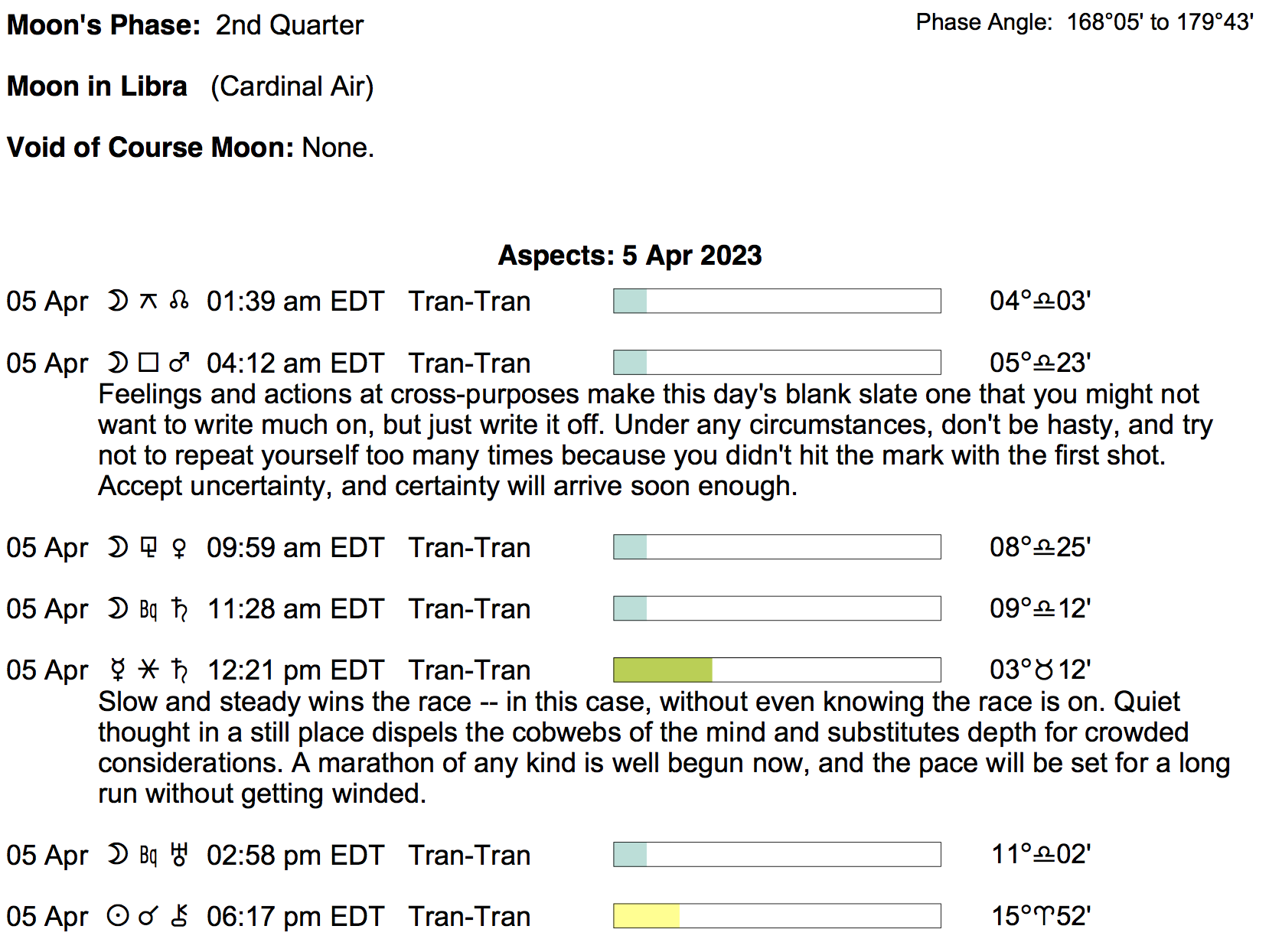Planet Color Key: The longer the bar, the slower the aspecting planet, and the longer the duration of the planet’s transit.