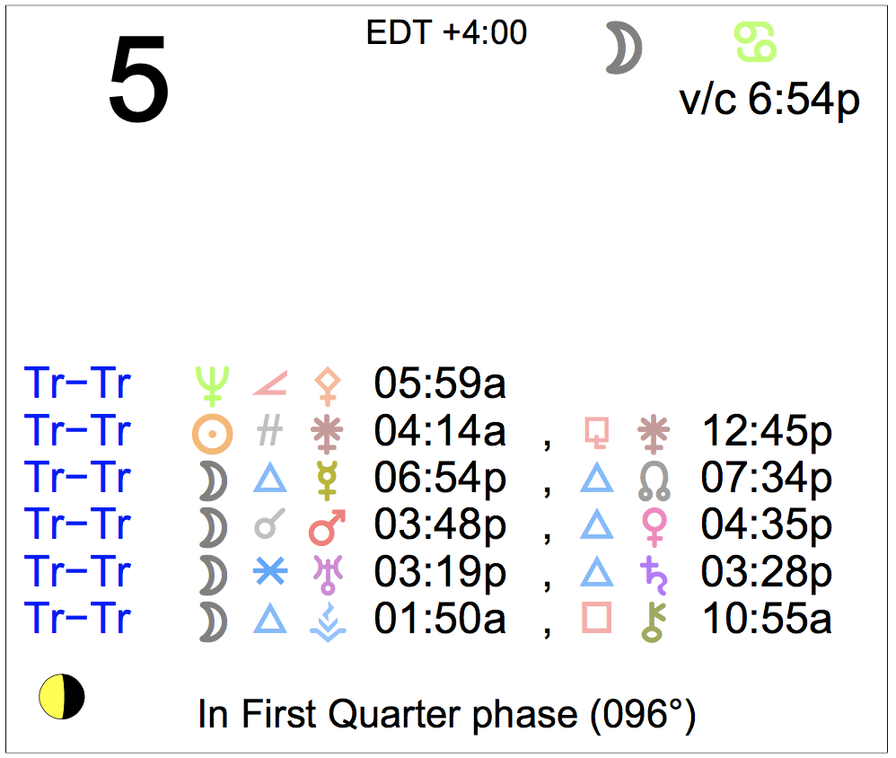 Planet Color Key: The longer the bar, the slower the aspecting planet, and the longer the duration of the planet’s transit.