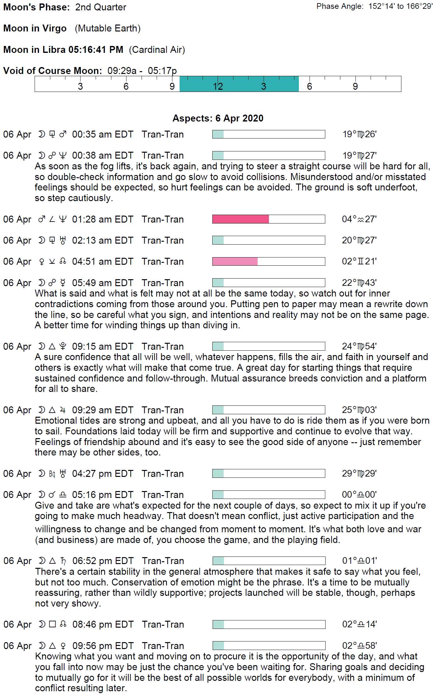Planet Color Key: The longer the bar, the slower the aspecting planet and the longer the duration of the planet’s transit.