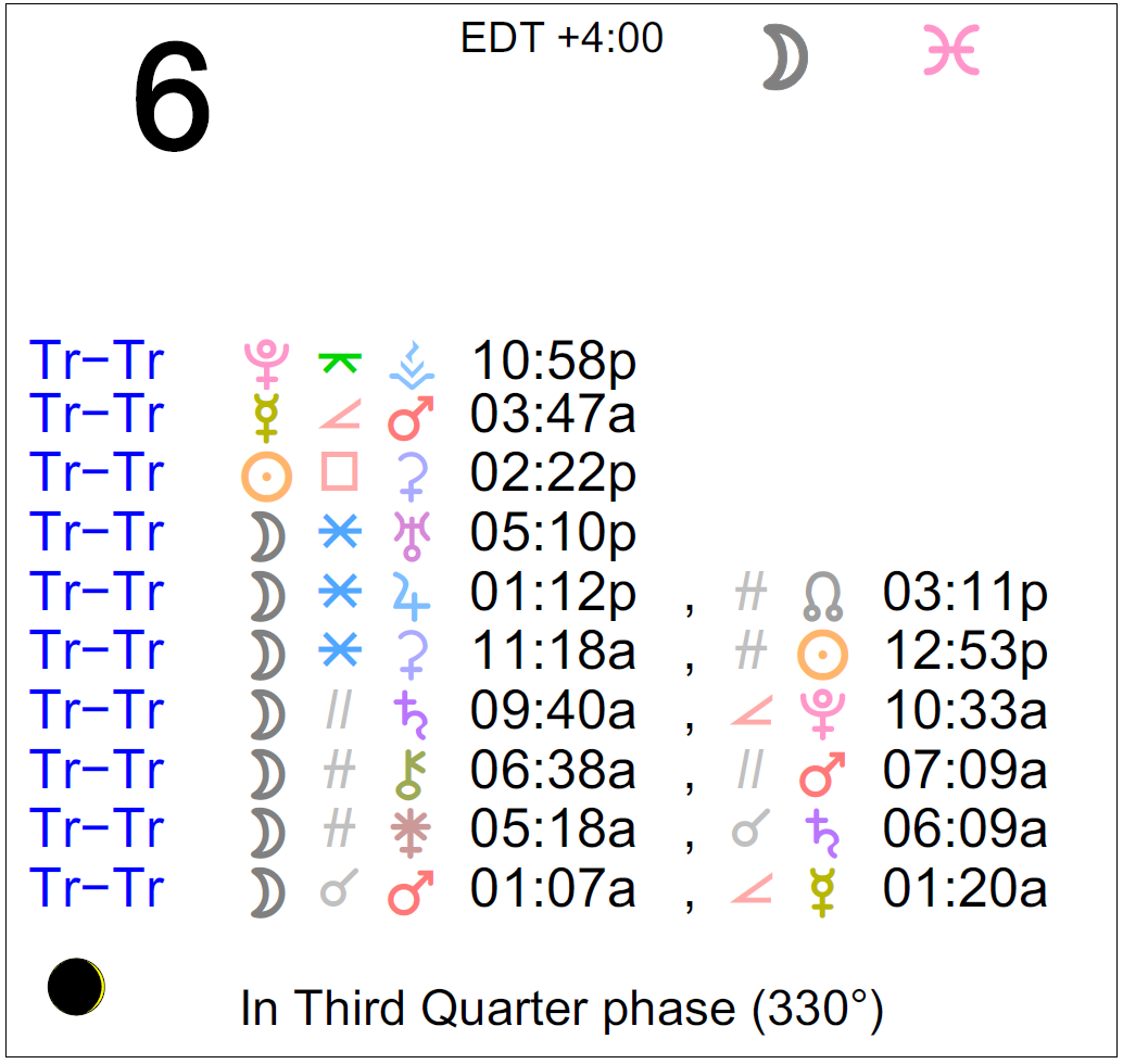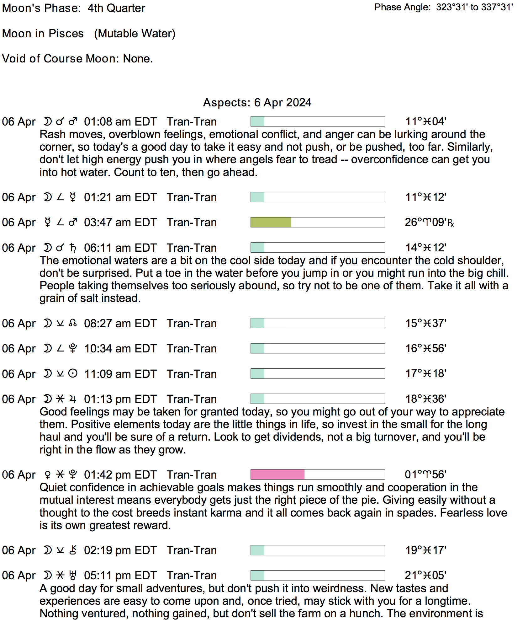 Planet Color Key: The longer the bar, the slower the aspecting planet, and the longer the duration of the planet’s transit.