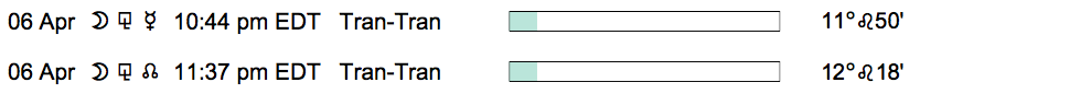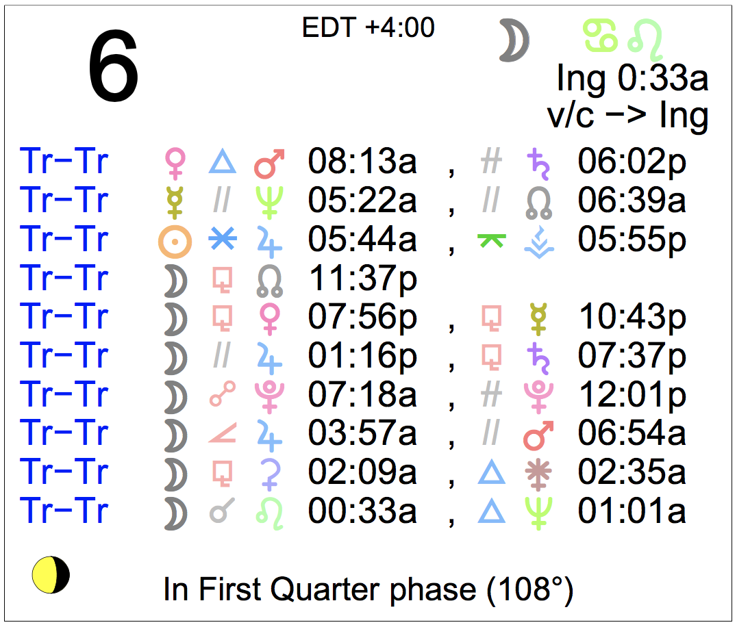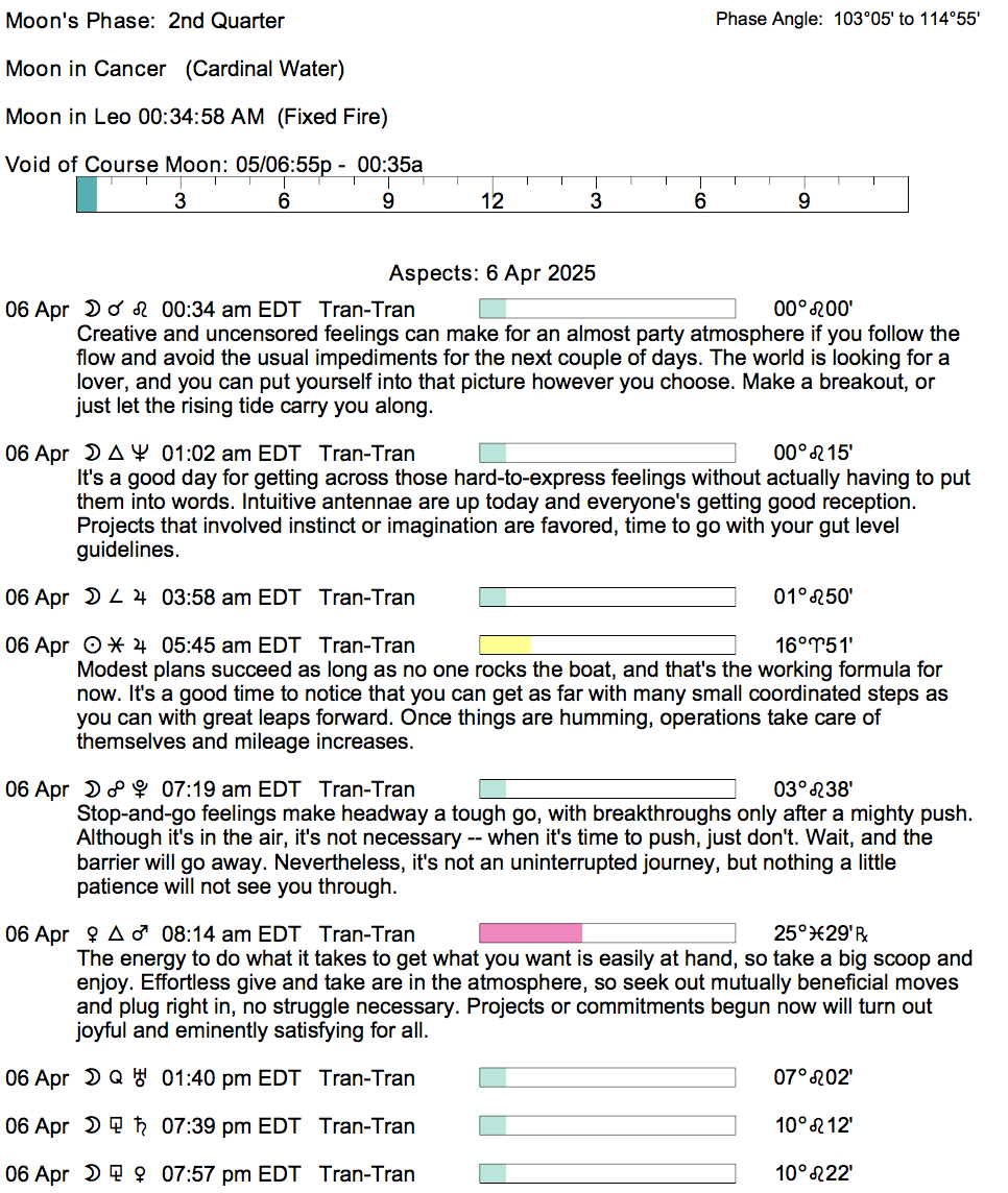 Planet Color Key: The longer the bar, the slower the aspecting planet, and the longer the duration of the planet’s transit.