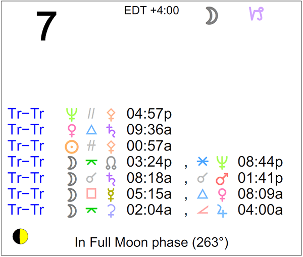 Planet Color Key: The longer the bar, the slower the aspecting planet and the longer the duration of the planet’s transit.
