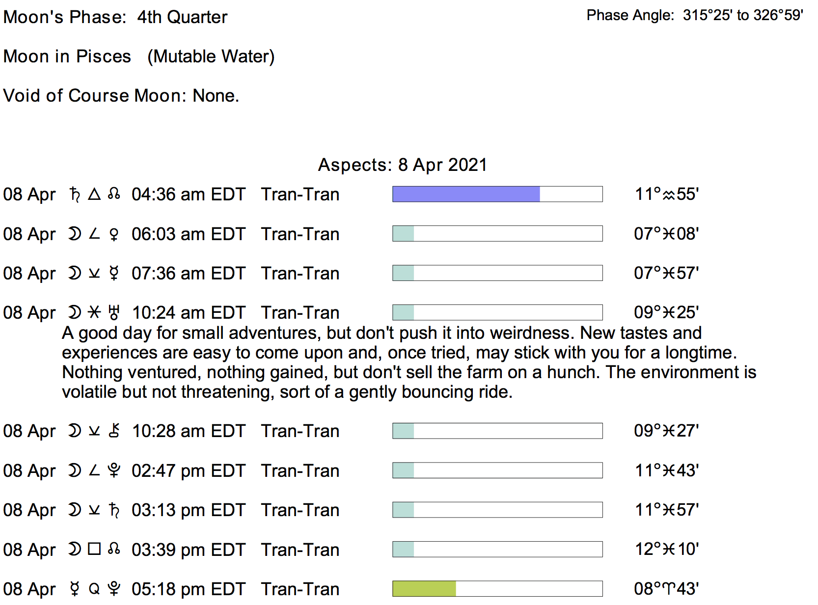 Planet Color Key: The longer the bar, the slower the aspecting planet, and the longer the duration of the planet’s transit.