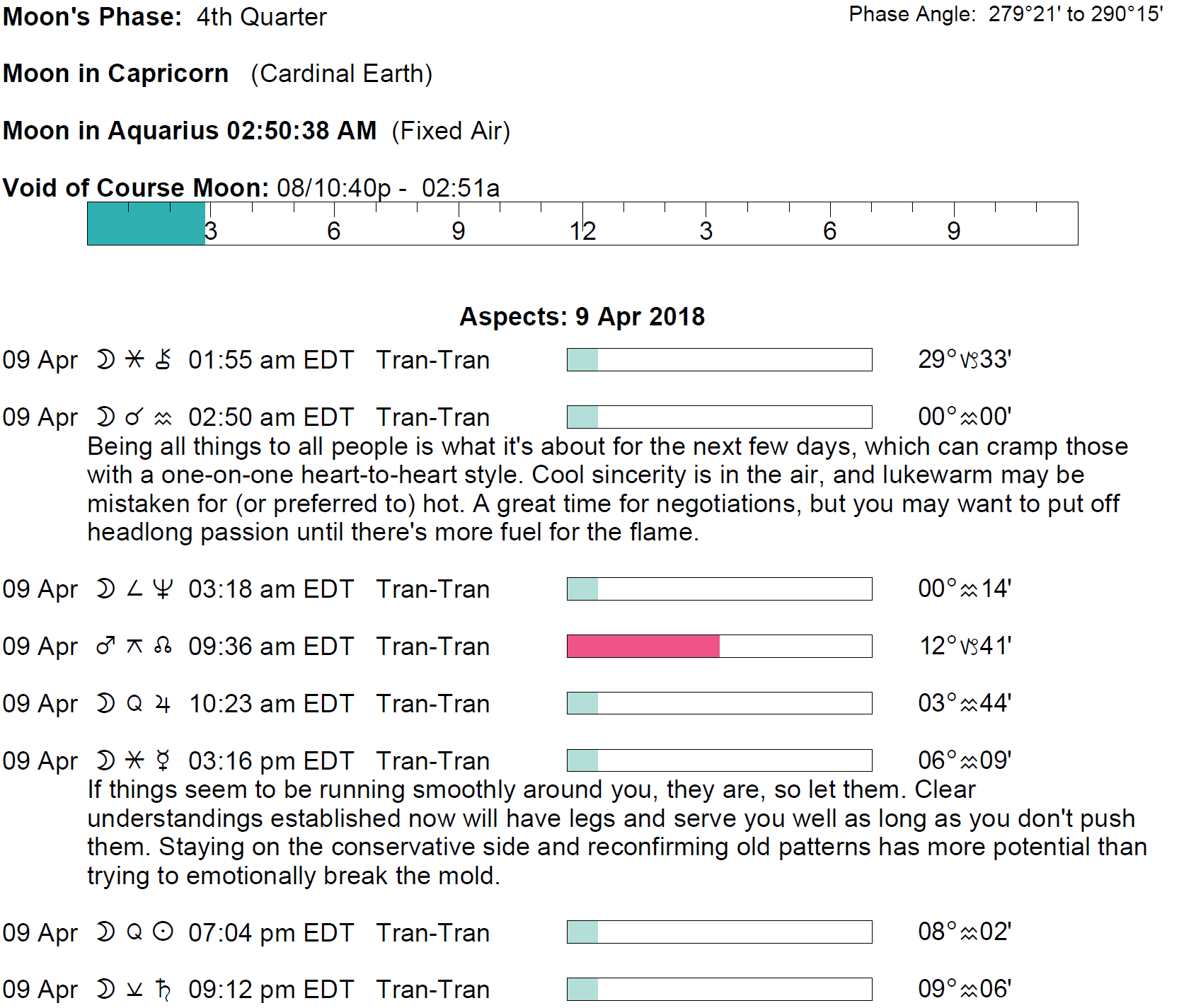 Planet Color Key: The longer the bar, the slower the aspecting planet and the longer the duration of the planet’s transit.