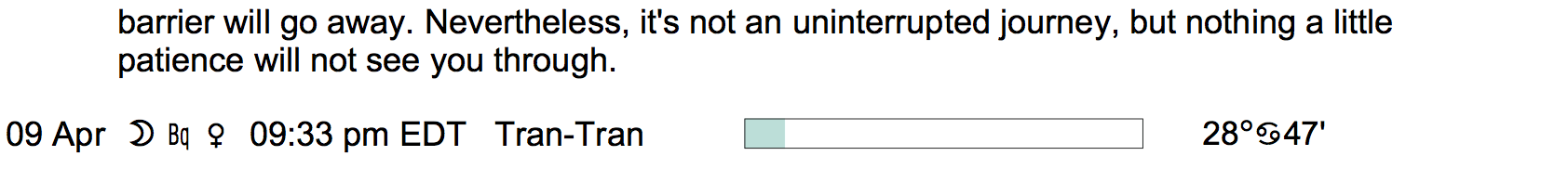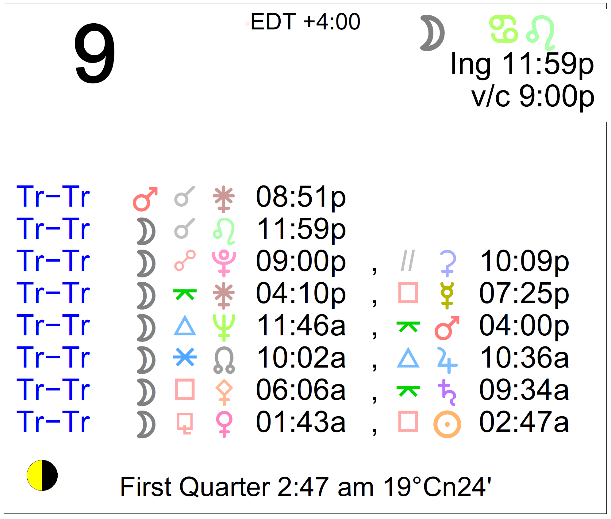 Planet Color Key: The longer the bar, the slower the aspecting planet, and the longer the duration of the planet’s transit.