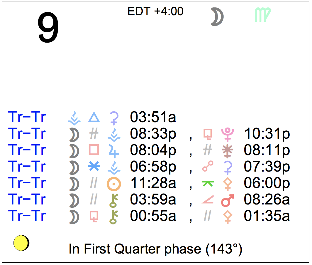 Planet Color Key: The longer the bar, the slower the aspecting planet, and the longer the duration of the planet’s transit.