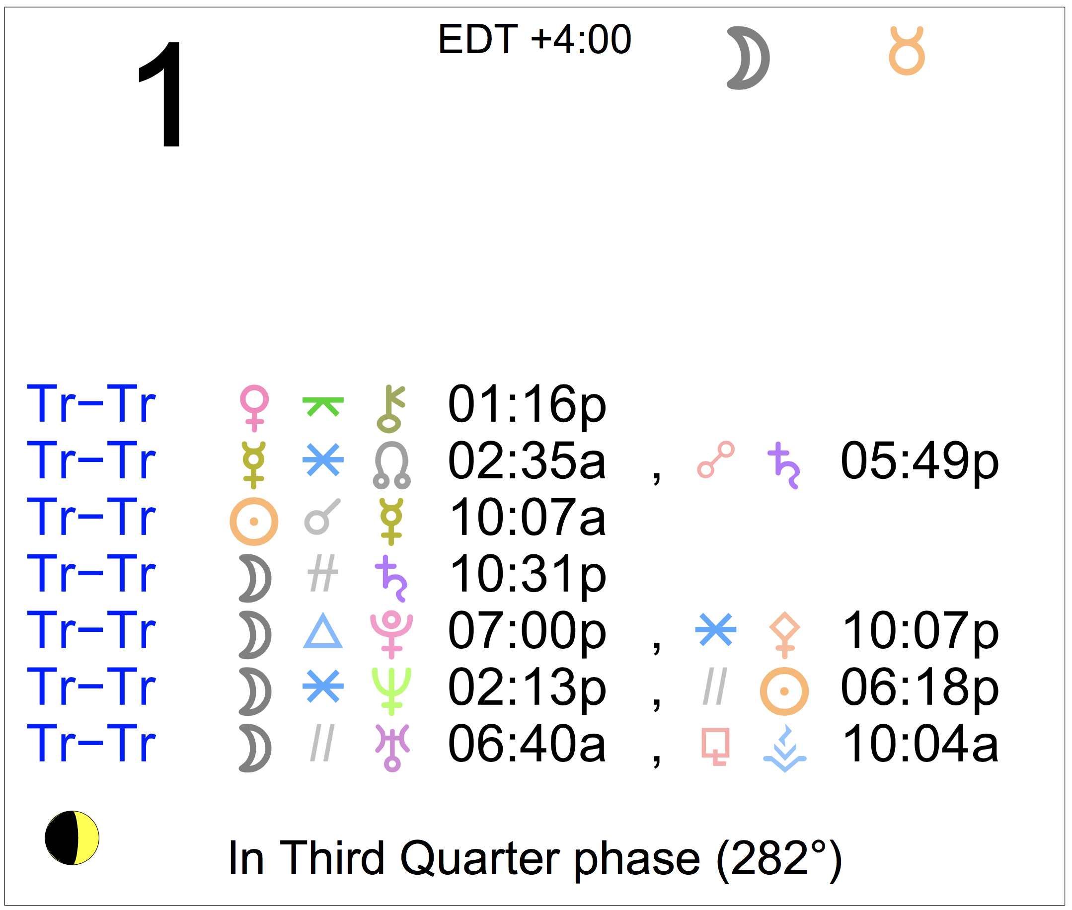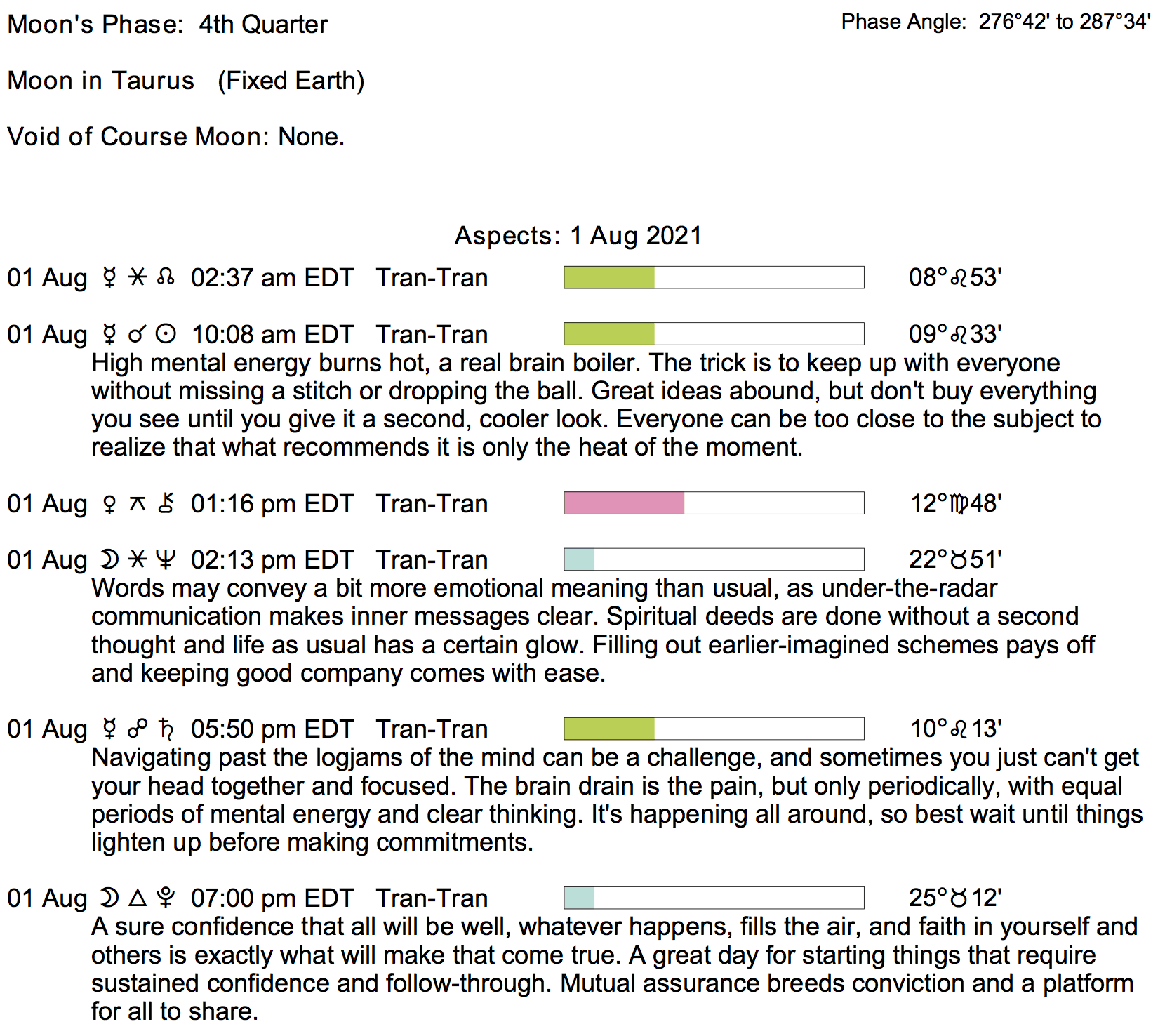 Planet Color Key: The longer the bar, the slower the aspecting planet, and the longer the duration of the planet’s transit.