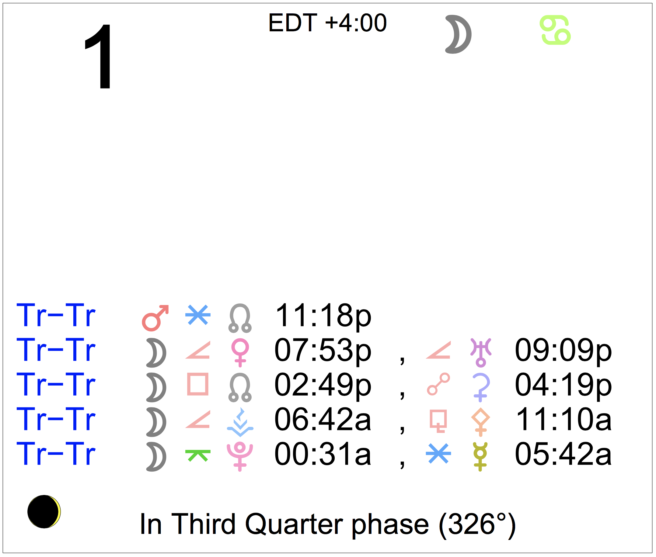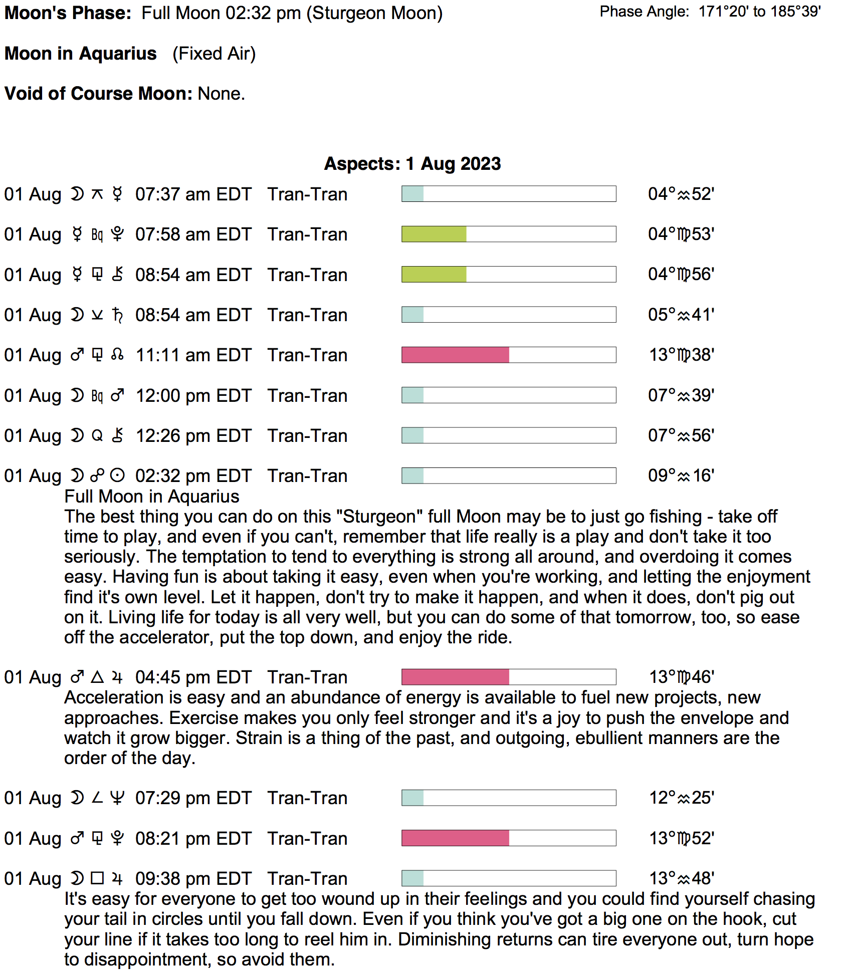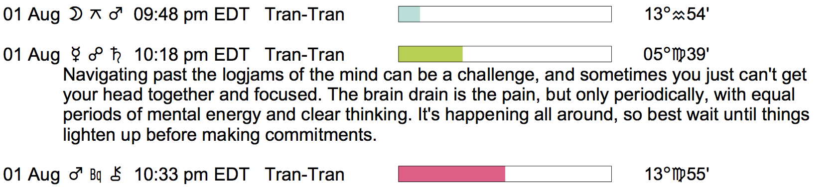 Planet Color Key: The longer the bar, the slower the aspecting planet, and the longer the duration of the planet’s transit.