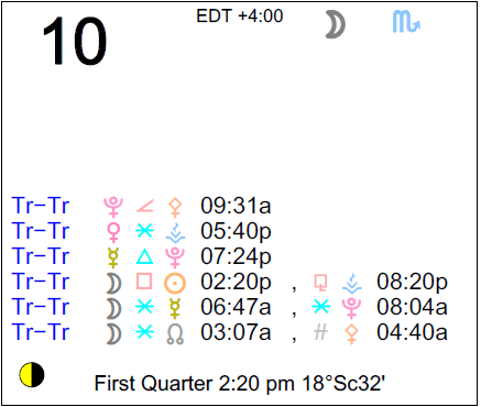 The following aspects (major only) and positions are at noon (EDT) on August 10th: