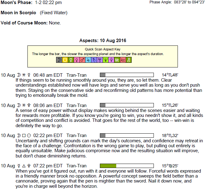 Note that the Moon moves at a rate of approximately one degree every 2 hours, so that if an aspect involving is applying and has an orb of 5 degrees, the aspect will perfect (be exact) in about 10 hours. If the Moon is separating from an aspect with an orb of 2 degrees, it has already formed said aspect approximately 4 hours ago (since the following are positions at noon today, then it would have occurred at about 8 AM today).