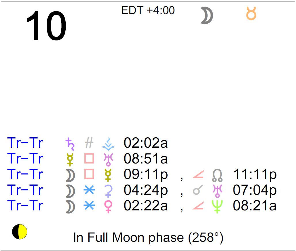 Planet Color Key: The longer the bar, the slower the aspecting planet and the longer the duration of the planet’s transit.