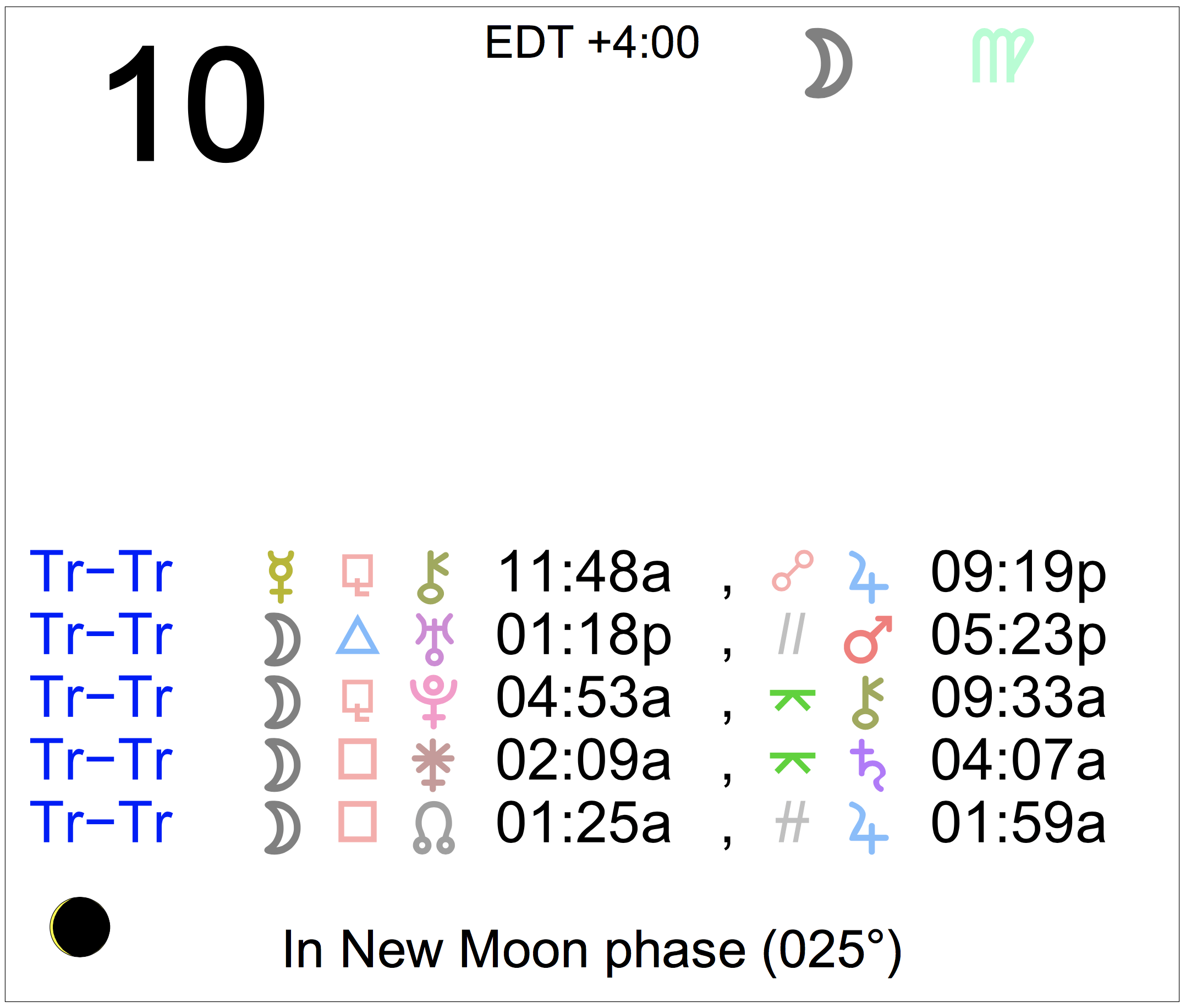 Planet Color Key: The longer the bar, the slower the aspecting planet, and the longer the duration of the planet’s transit.